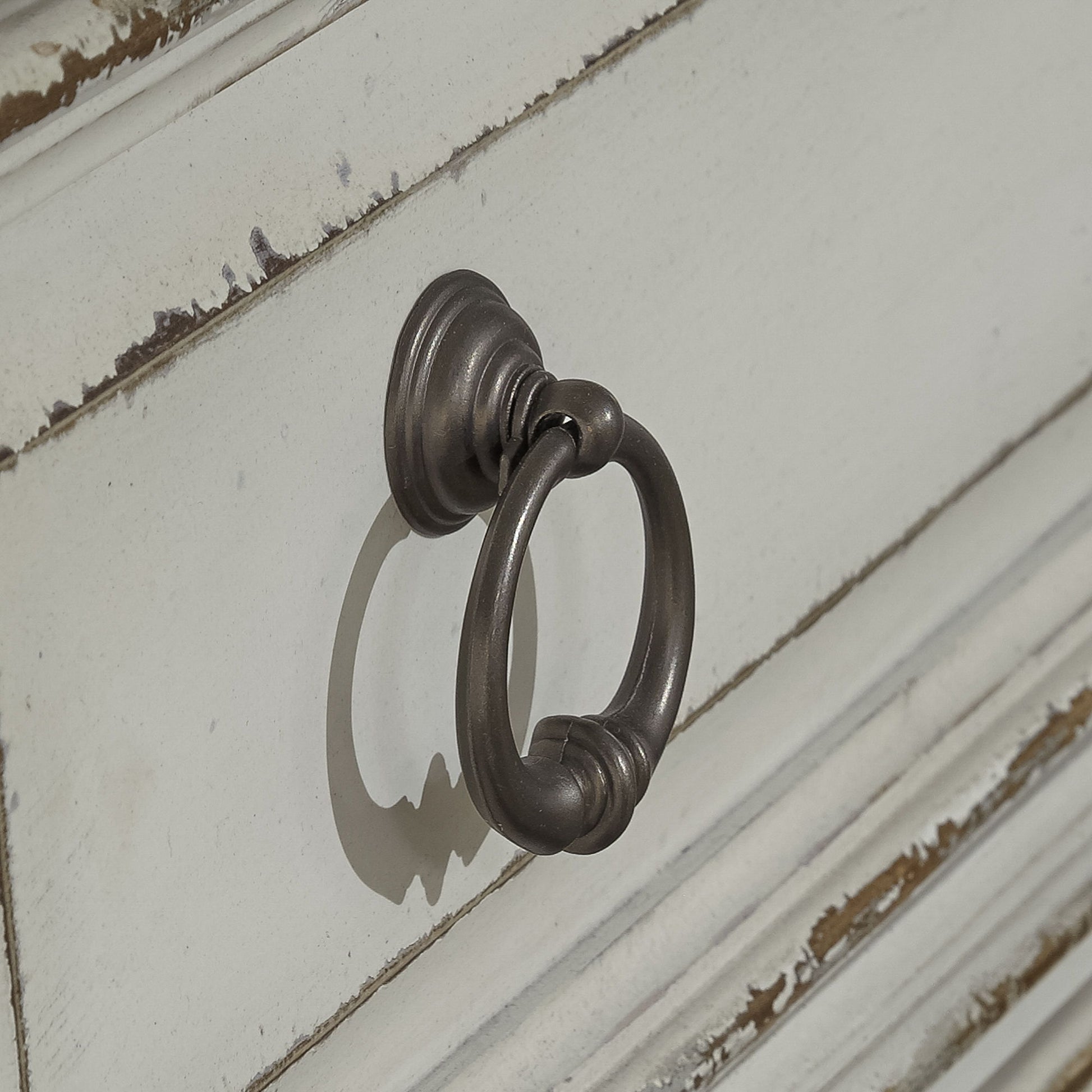 Design possibilities are endless with the Abbey Park panel bed, dresser, and mirror. Crafted of poplar solids and cathedral white oak veneers, this kit features an antique white finish with heavy chipping and weathered brown whitewash tops, full extension drawers, premium felt lined top drawers and cedar lined bottom drawers, and is accented with antique pewter bail pull and drop ring hardware. The panel bed features heavy crown molding and raised panel accents framed by bead molding. The dresser has seven drawers and can equip the mirror that features a beveled edge with the included bolt-on supports. The blending of European traditional design influences makes Abbey Park a truly unique style for any living space.