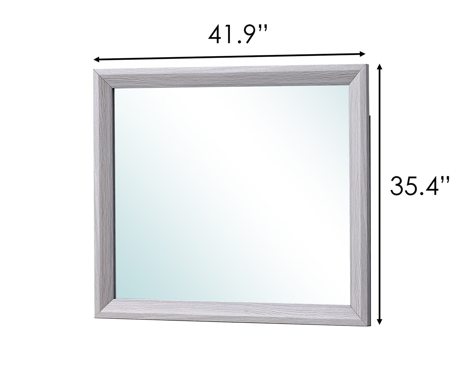 This bedroom set is the embodiment of understated sophistication, featuring a neutral finish that complements its clean and contemporary design. The robust bed frame anchors the room with a sense of sturdiness and style. Accompanying the bed are coordinating pieces: a dresser with a large mirror, a tall chest for additional storage, and a nightstand to keep essentials within reach. Each piece is crafted with sleek, straight lines and fitted with rectangular cup pulls, creating a cohesive look that’s both modern and timeless.