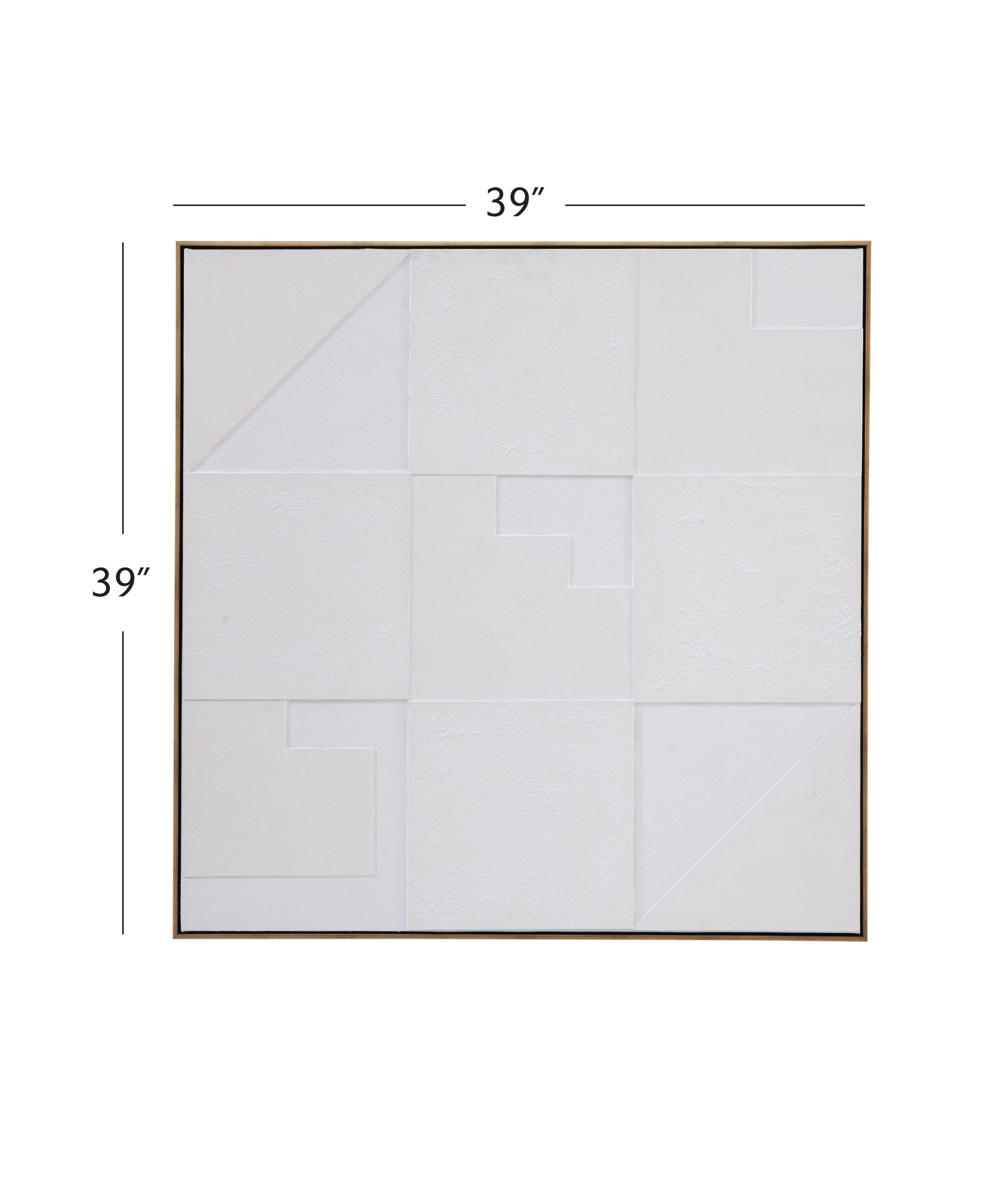 Adema is a wall hanging featuring a 3-D relief geometric design with an antique gold molding.