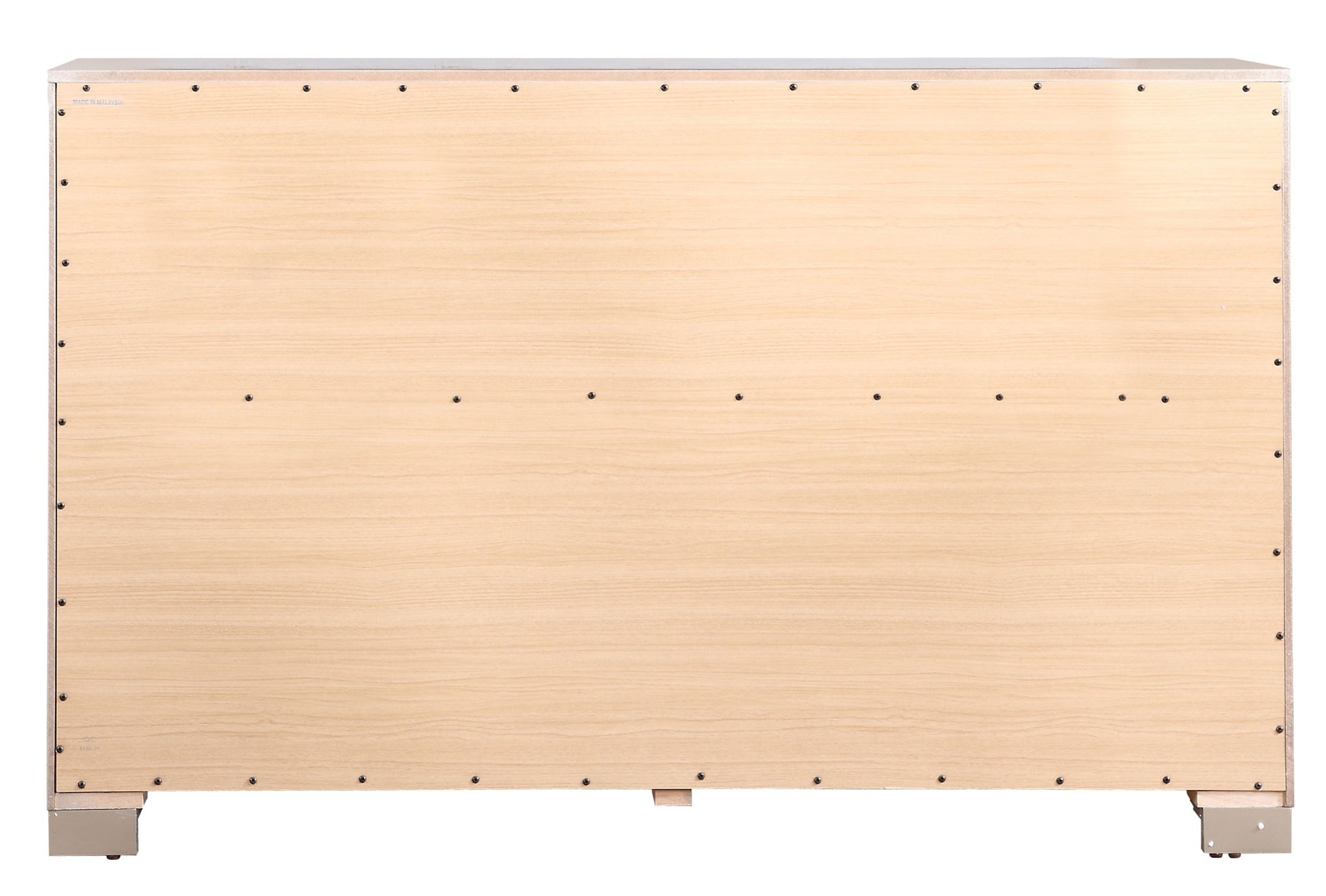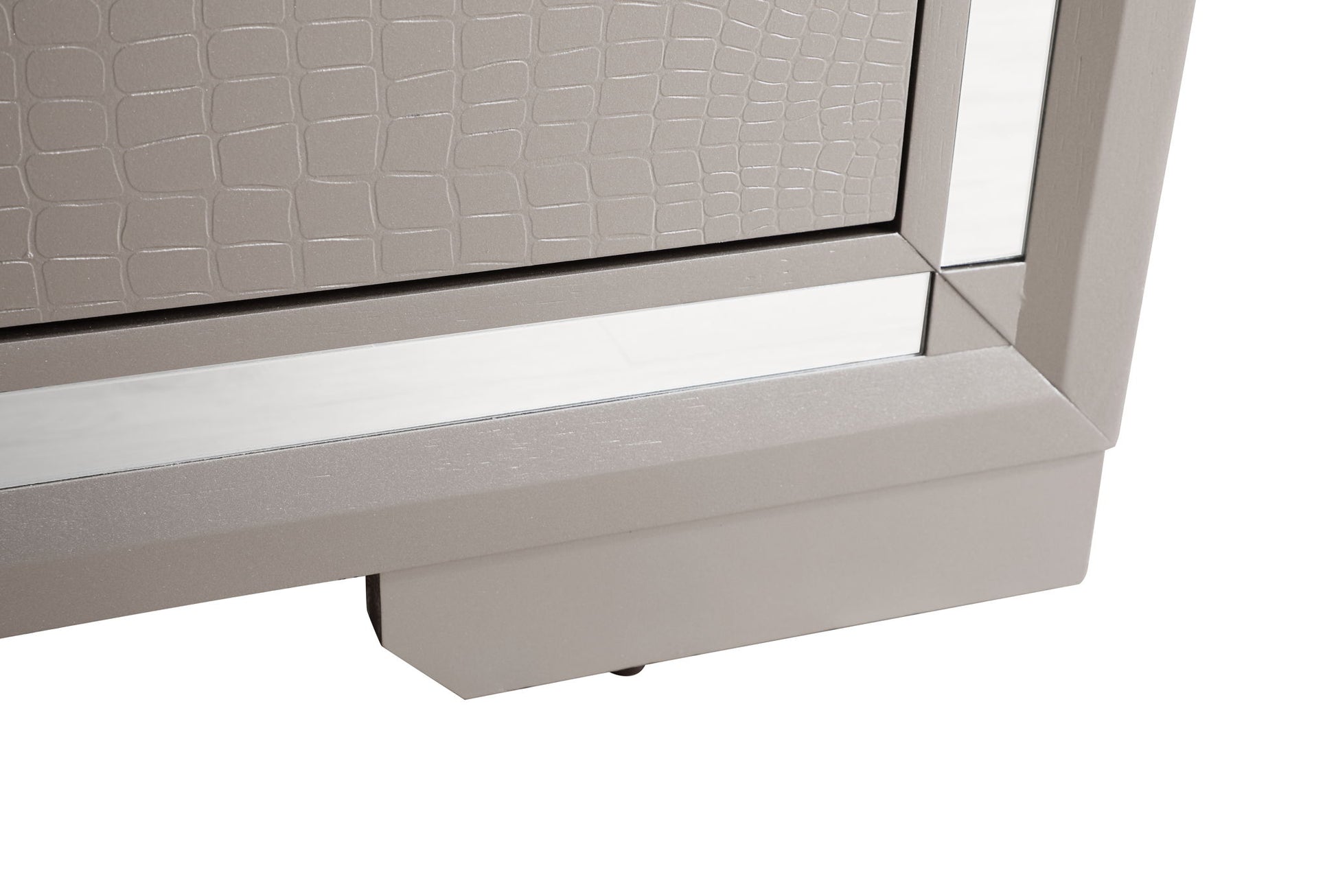 This stunning dresser in Silver Champagne is a remarkable blend of functionality and visual impact. The croc textured finish provides an intriguing surface that attracts attention, while the jewelled chrome hardware elevates its elegance, adding a sophisticated touch that enhances various bedroom styles. With overall dimensions of 38 inches in height, 62 inches in width, and 17 inches in depth, this dresser is designed to fit seamlessly into different room layouts, providing not just a storage solution but also a stylish accent piece. The ample storage space within features full extension drawers, allowing for easy access to all your items without compromise. The dovetailed joints add to the construction’s robust nature, offering stability and resilience over time. This large-scale dresser becomes a statement piece in your bedroom, enriching the overall ambiance while maintaining practicality for everyday use. Experience the perfect blend of style and utility with this extraordinary addition to your home.