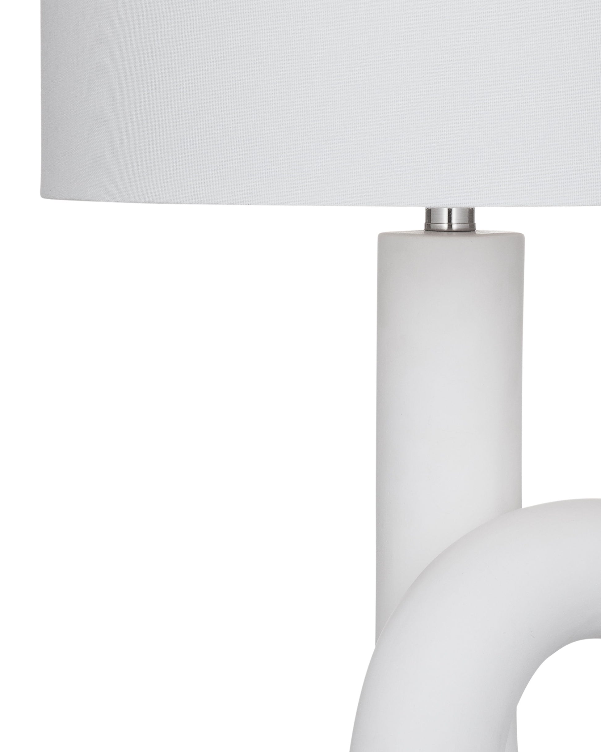 The Alexx Table Lamp features a bold and artistic modern style, with a matte white resin body that curves into an abstract loop, offering a playful yet sophisticated form. Its unique structure acts as a sculptural element, while the uniform matte finish enhances its contemporary appeal. Topped with a white drum shade, the lamp provides a cohesive look that is versatile enough to complement a range of decors, adding a touch of modern artistry to any space.