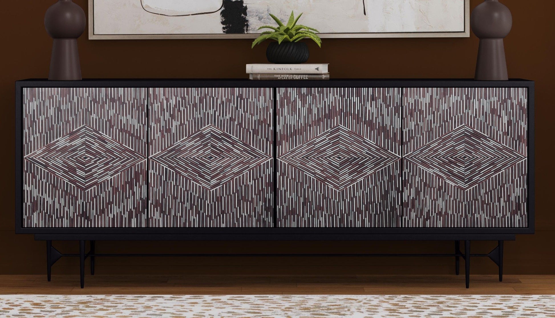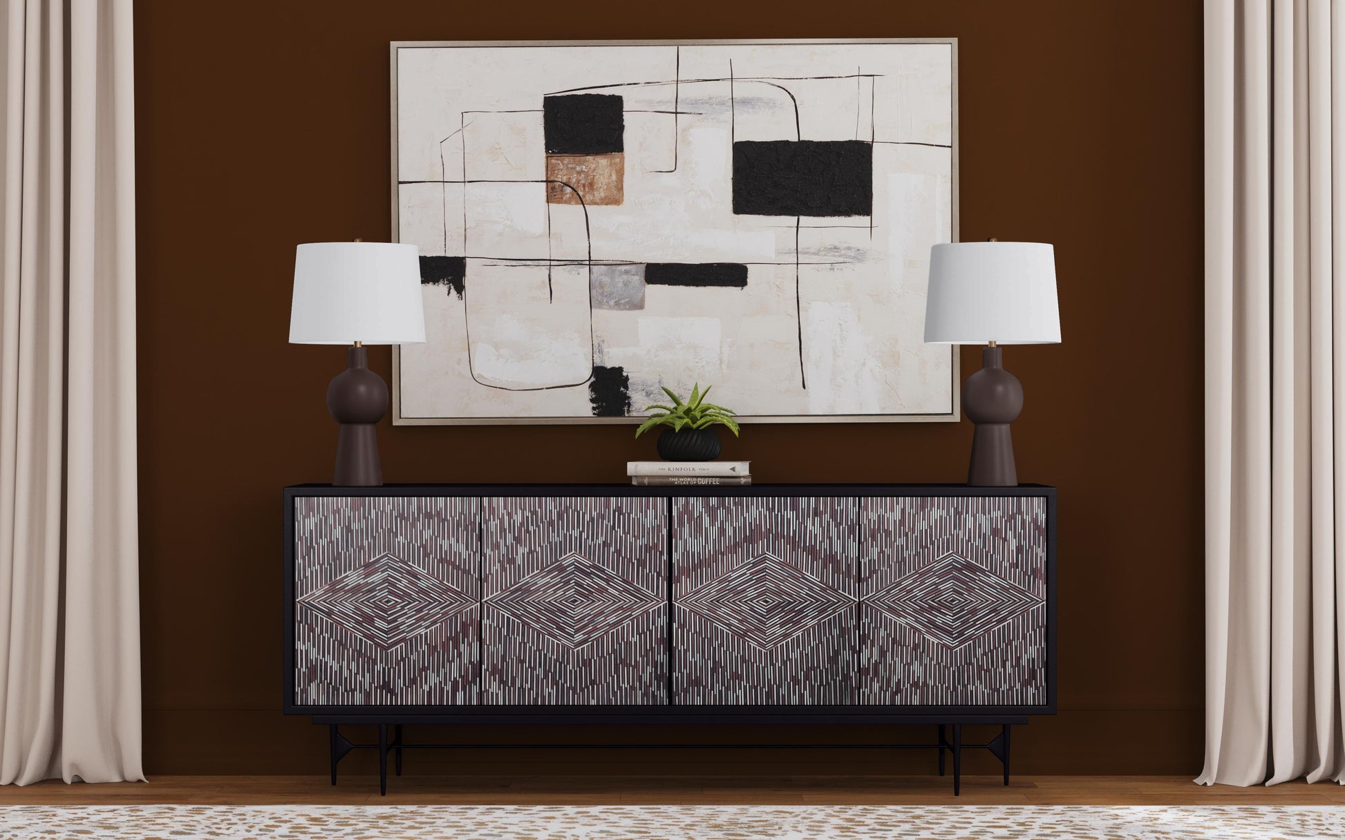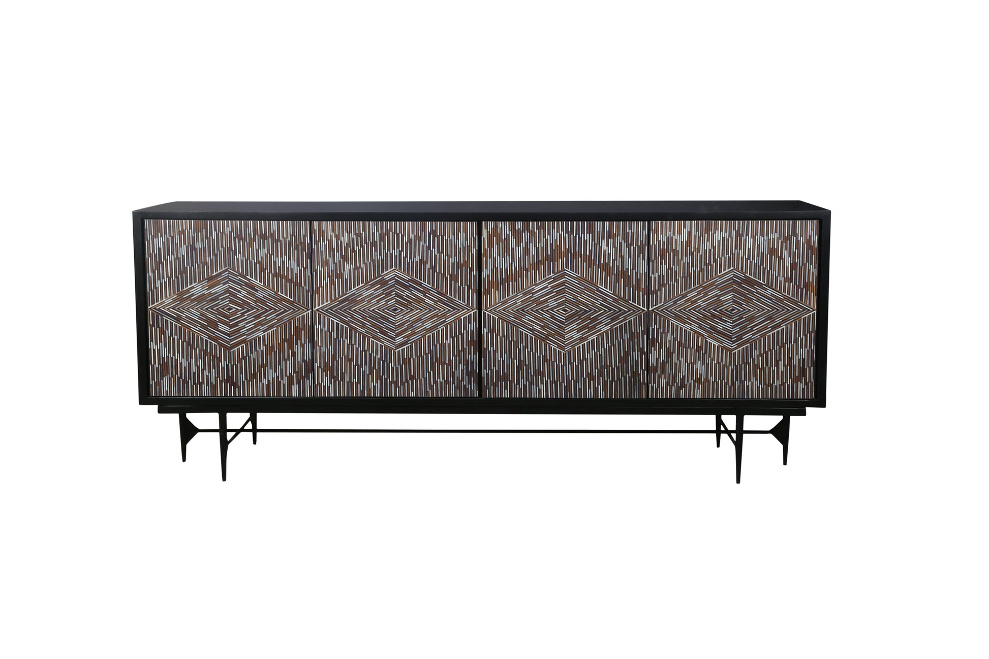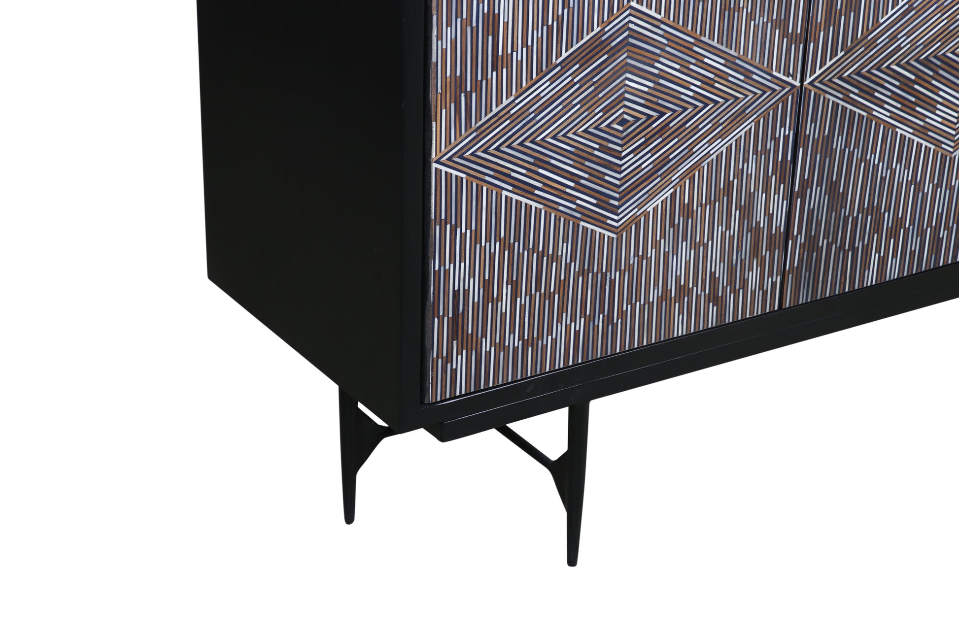 The Andreas Server features a stunning contemporary design, blending striking materials and a visually captivating diamond patterned door design. Crafted from solid mango wood in an ebonized finish, the case frame exudes elegance and depth. The doors are a standout element, showcasing a unique mix of multi colored bone and resin, creating an intricate, eye-catching pattern. The custom-designed thin iron base elevates the piece, adding a sleek, modern feel. Behind the four doors, you'll find fixed shelves and media cord management, offering both style and functionality in a beautifully crafted piece.