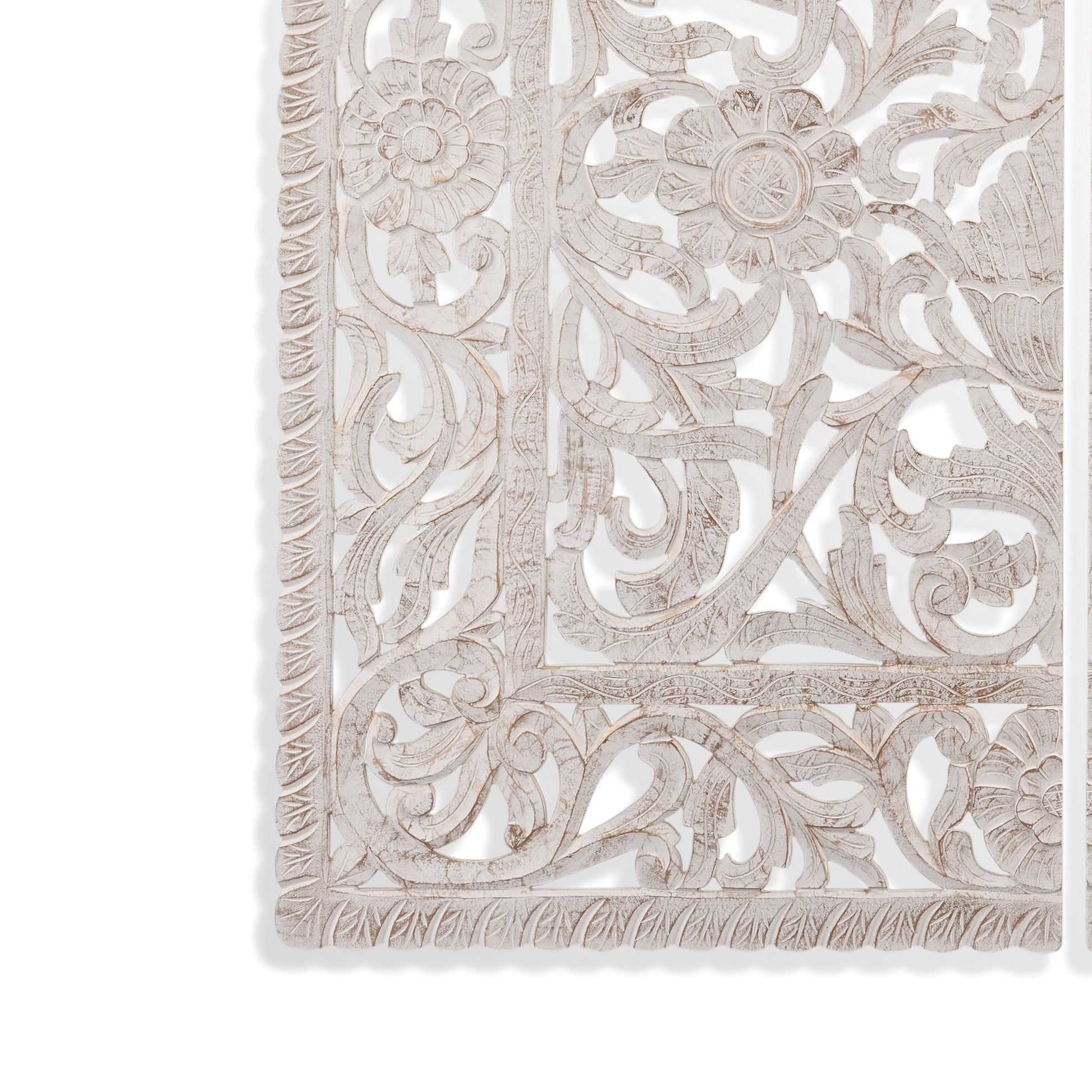 Arched wall hanging is a 2 piece set featuring a floral cutout design.