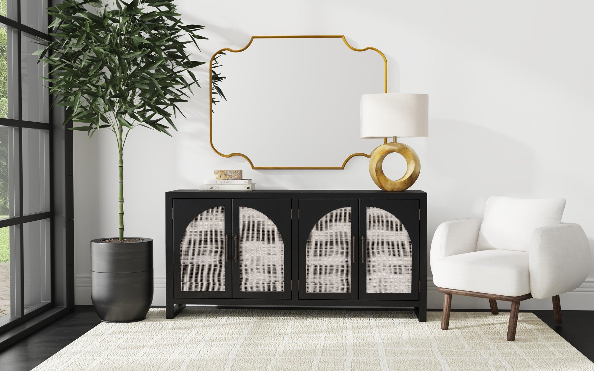 - Arched box-weave cane door fronts contrast the black wood doors for a modern, boho style