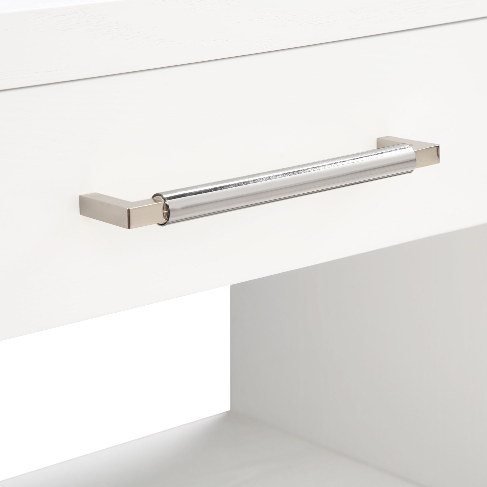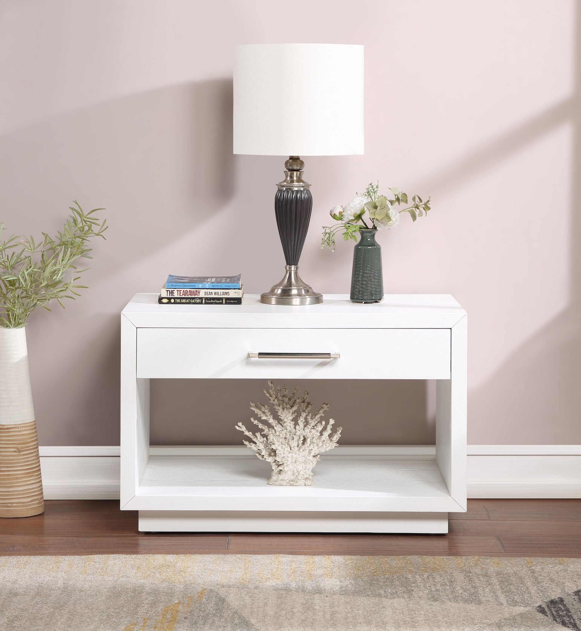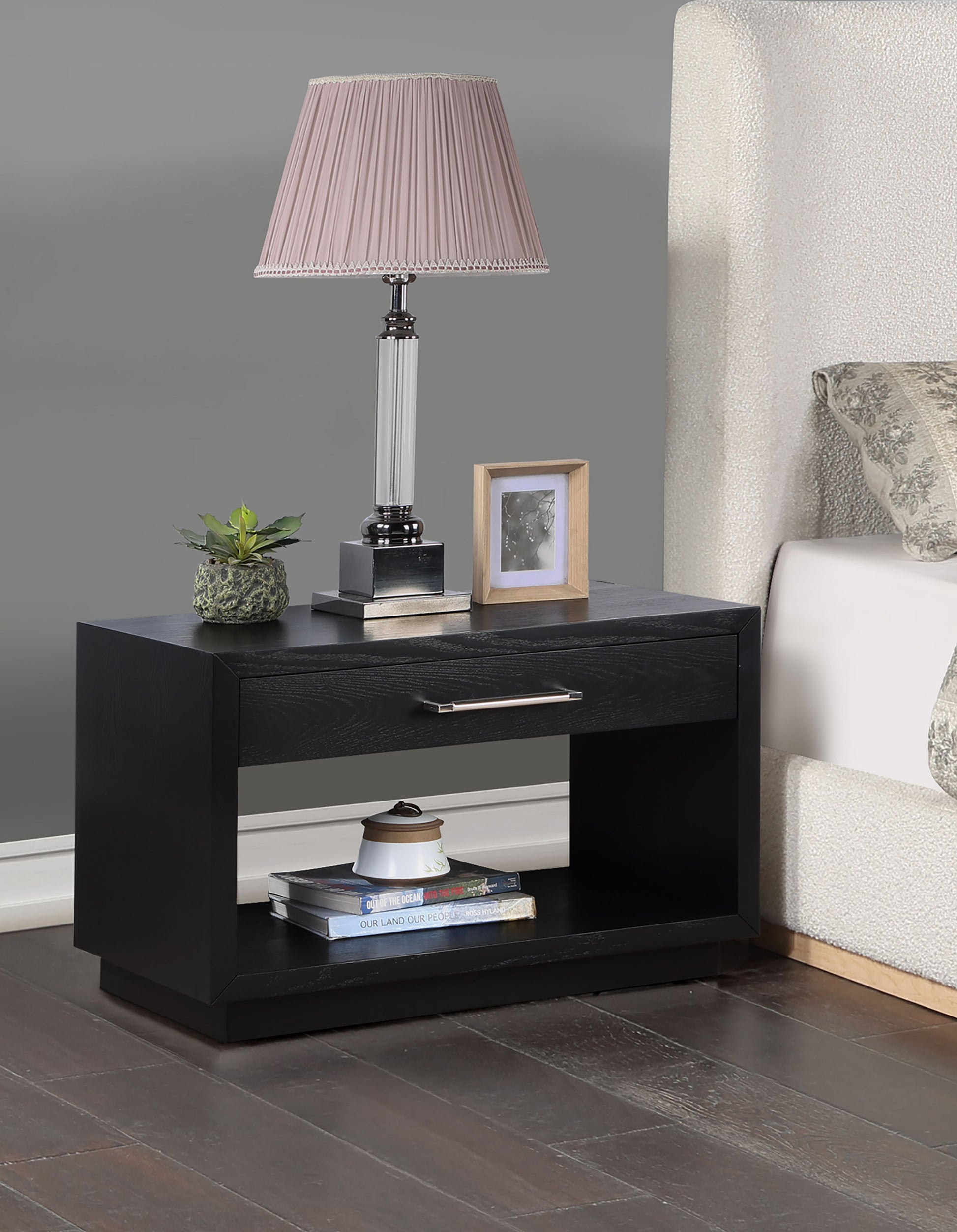 Give your room a makeover with this Avery wood veneer night stand from Meridian Furniture. This open-spaced, rectangular night stand features rich ash wood veneer finish, ensuring it complements your existing bedroom decor. A small drawer in the front provides you with extra space to store reading glasses, nighttime reading material, and more.
