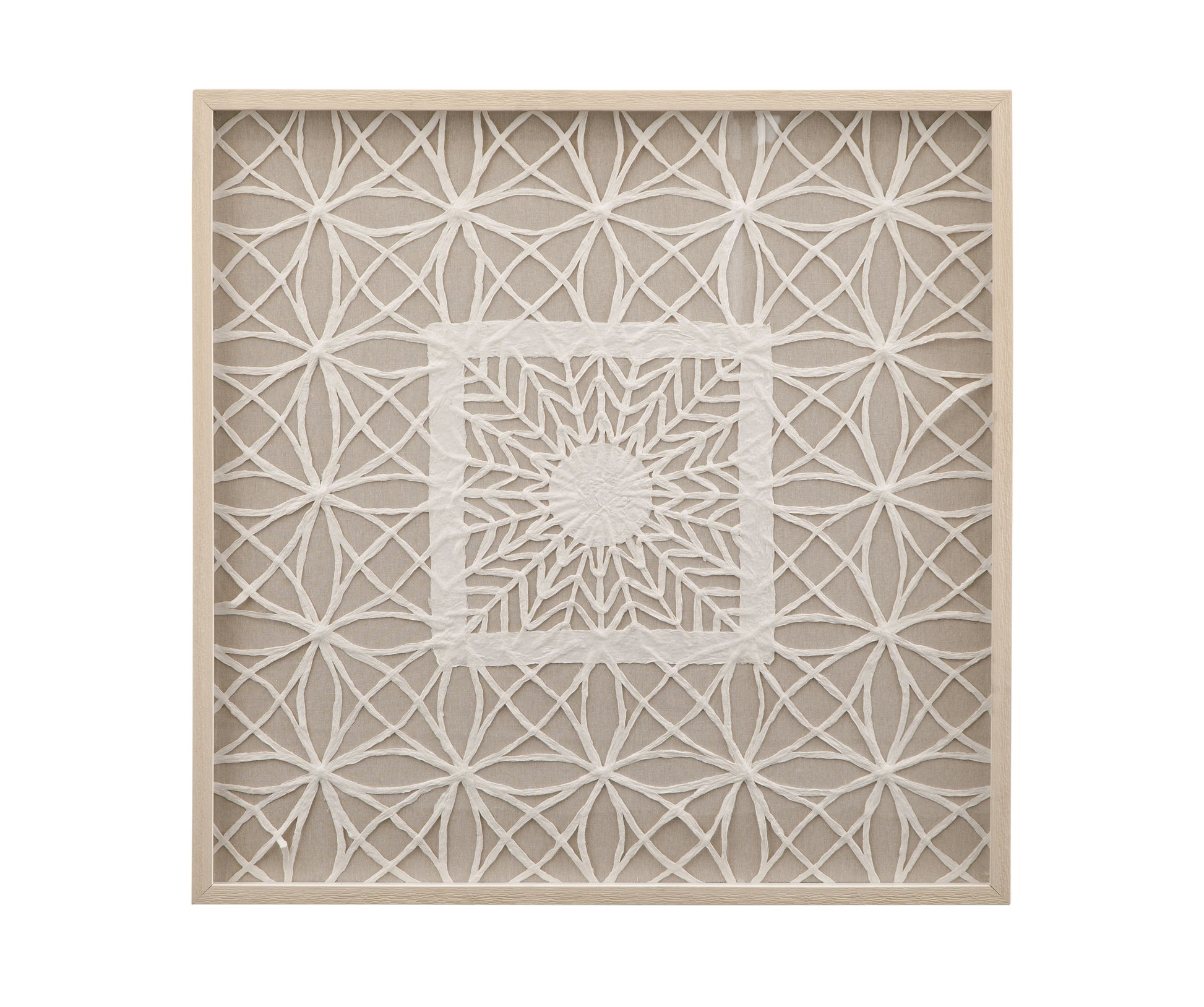 Baize Wall Art is uniquely crafted piece of art featuring woven natural materials framed in a shadow box under glass in a natural wood frame.