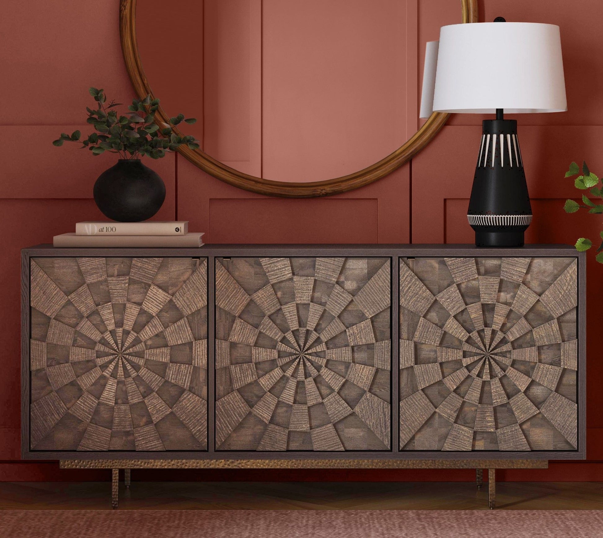 - Rustic Boho charm with a unique sunburst pattern on the three-door Bates Server
