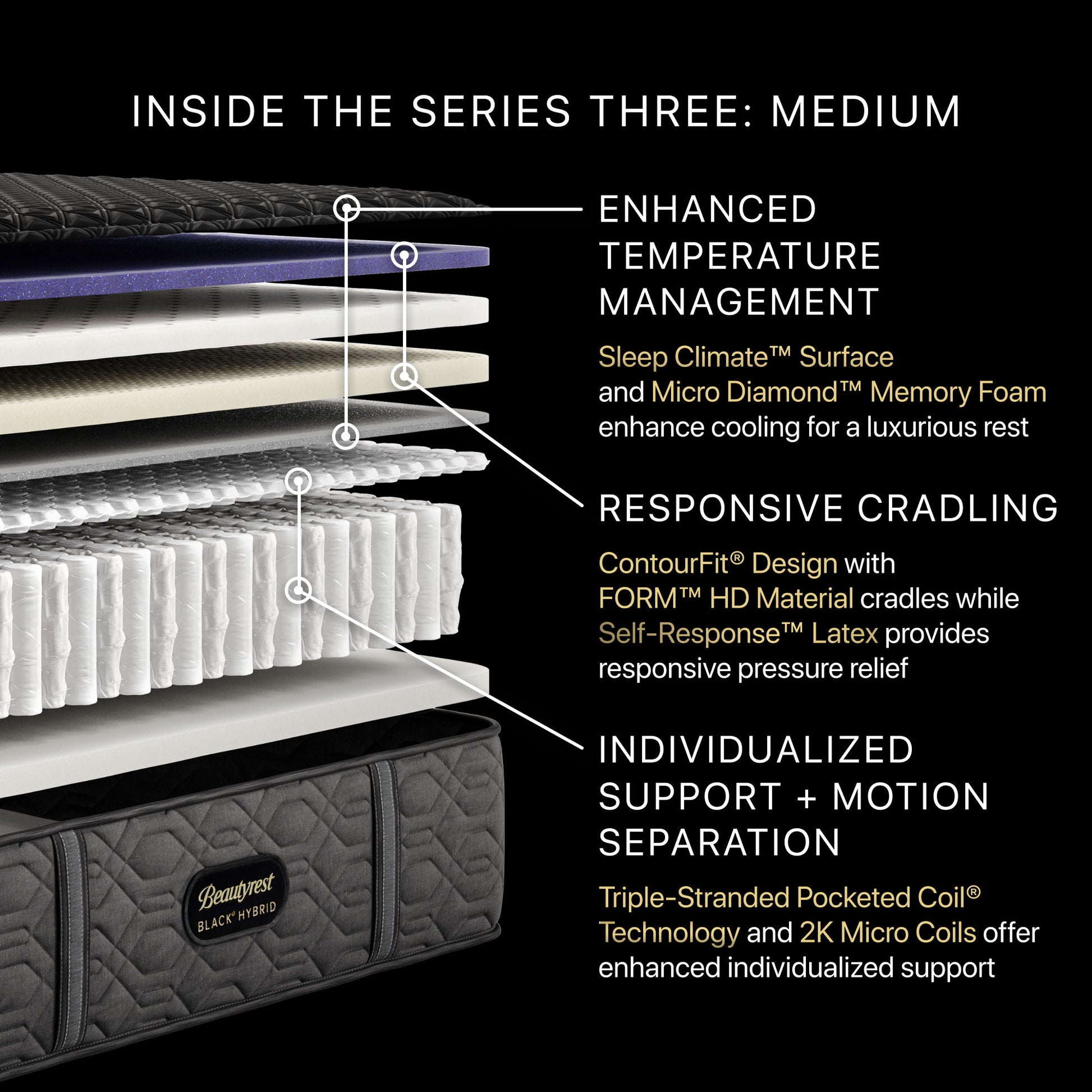 Experience the best of both worlds with the reimagined Beautyrest Black® Hybrid mattress—the latest advancement from the creators of the original Hybrid mattress. Rest undisturbed as Triple-Stranded Pocketed Coil® Technology and a 2K Micro Coil* upgrade deliver enhanced, individualized support and motion separation, isolating movement between sleepers while conforming to support their unique shapes. Our patented ContourFit® Design, located at the mattress surface, allows you to melt directly into our contouring FORM™ HD Material as it cradles every curve to relieve pressure. Meanwhile, a Self-Response™ Latex upgrade also contours to your body for responsive pressure relief. Our cool-to[1]the-touch Sleep Climate™ Surface and a Micro Diamond™ Memory Foam upgrade enhance cooling for a luxurious rest. Plus, our FORM™ HD Material provides up to 3X better airflow**, so you sleep comfortably all night. The best of individualized support, motion separation, and pressure-relieving comfort await in a mattress designed to excel in all. Invest in your rest, and discover your best, with the reimagined Beautyrest Black® Hybrid. *Available in the Series Three Medium Model **Compared to the same mattress with a non-open celled memory foam in the place of the FORM™ HD Material