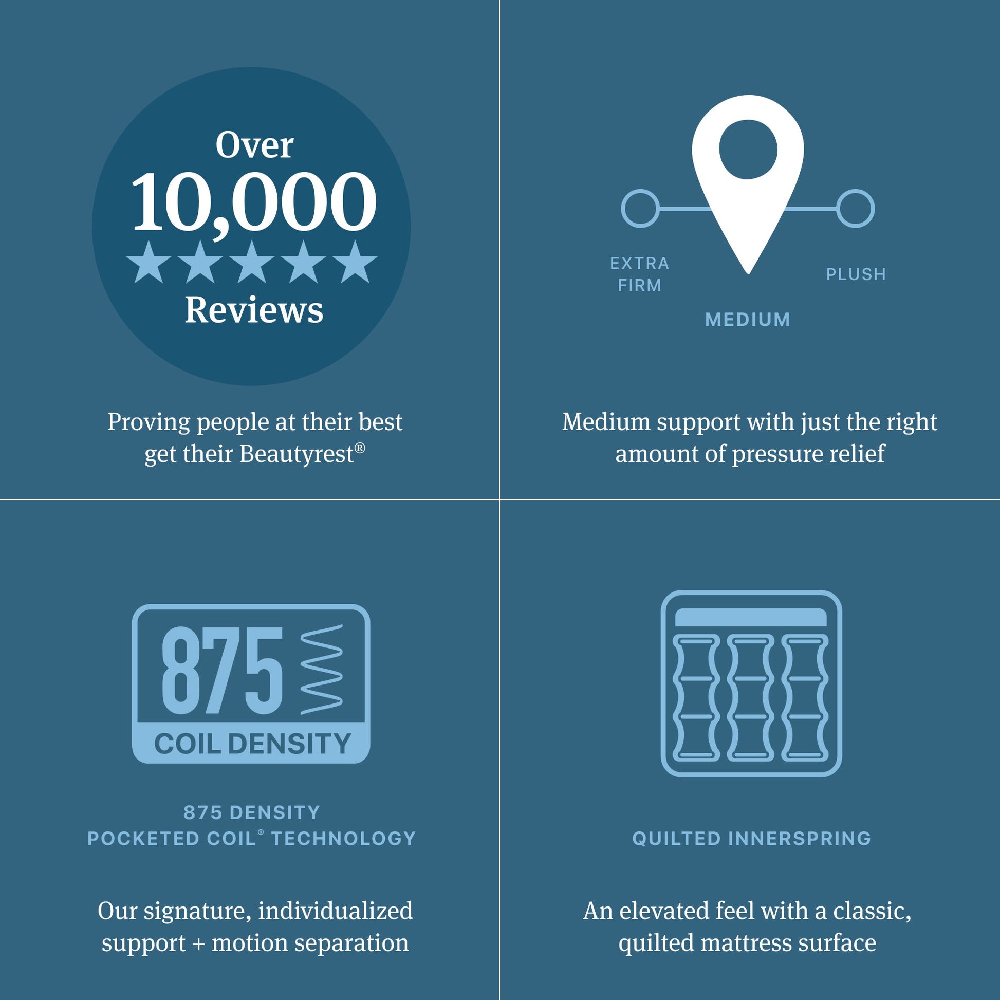 There's sleep, and then there's Beautyrest®. With the new Beautyrest® mattress collection, 875-density Pocketed Coil® Technology provides our signature individualized support + motion separation, while the Beautyrest® ActiveResponse™ Memory Foam provides contouring comfort designed to help alleviate aches and pains. Sleep comfortably with a cooling sleep surface provided by InfiniCool® Technology. With 100 years of innovation behind us and many, many more ahead, our latest collection shows exactly how people at their best, get their Beautyrest®.