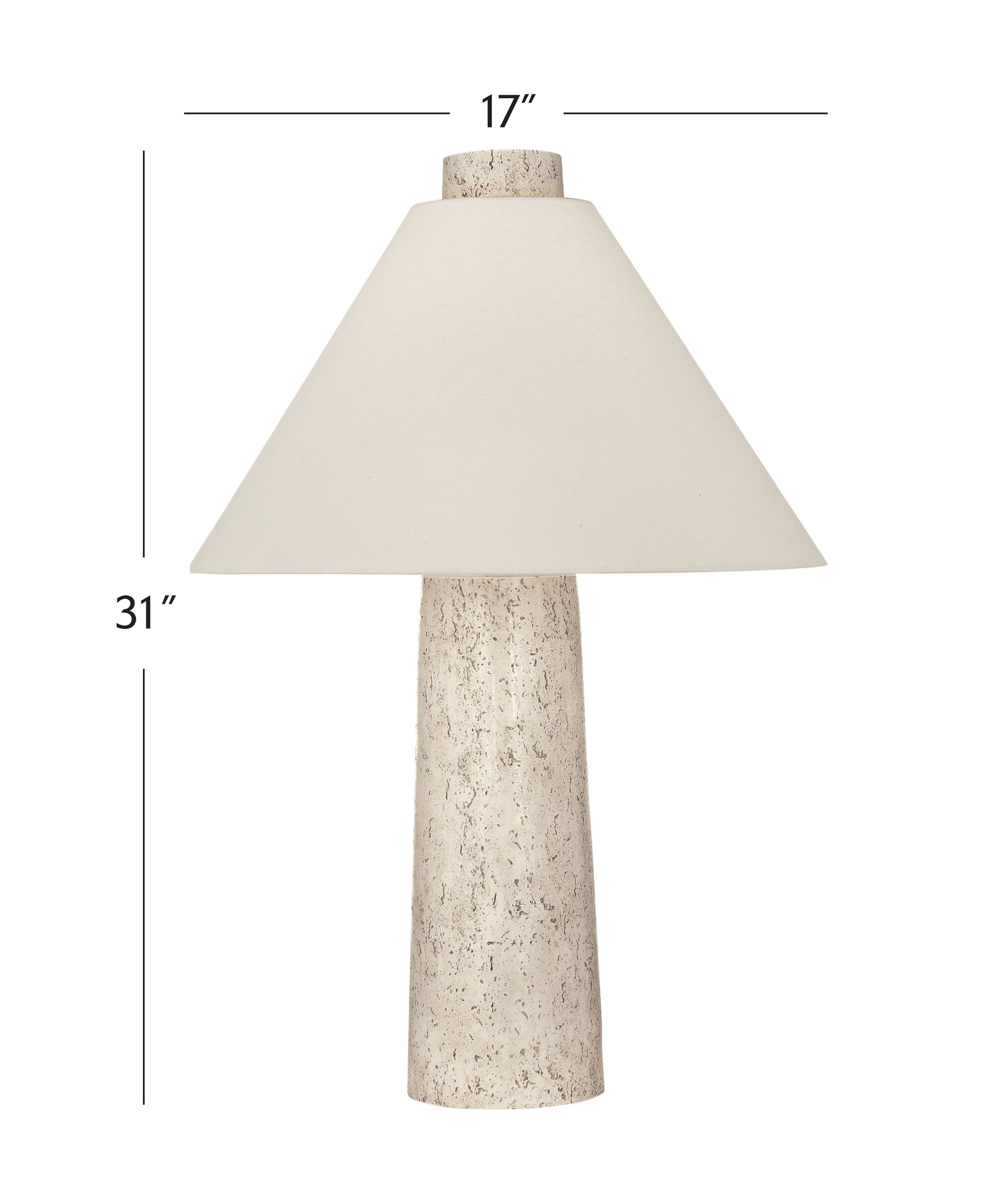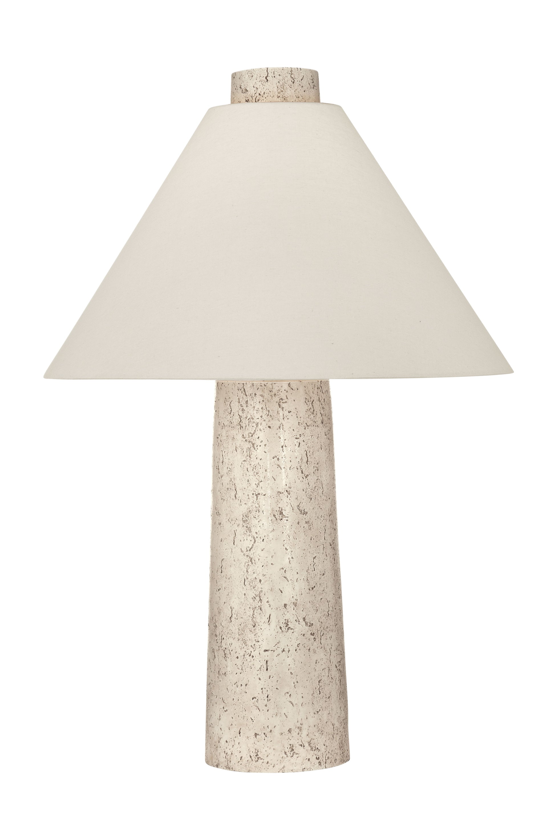 The Berks Table Lamp is distinguished by its textured cream-colored resin body, which offers a contemporary take on rustic aesthetics. The body's heavily textured surface adds a tactile quality to its simple, cylindrical form. This is beautifully contrasted by the smooth, tapering cone shape of the lampshade, creating a harmonious blend of texture and form. The neutral cream palette ensures that the lamp will complement a wide range of interior color schemes and styles, from minimalist to more eclectic tastes.
