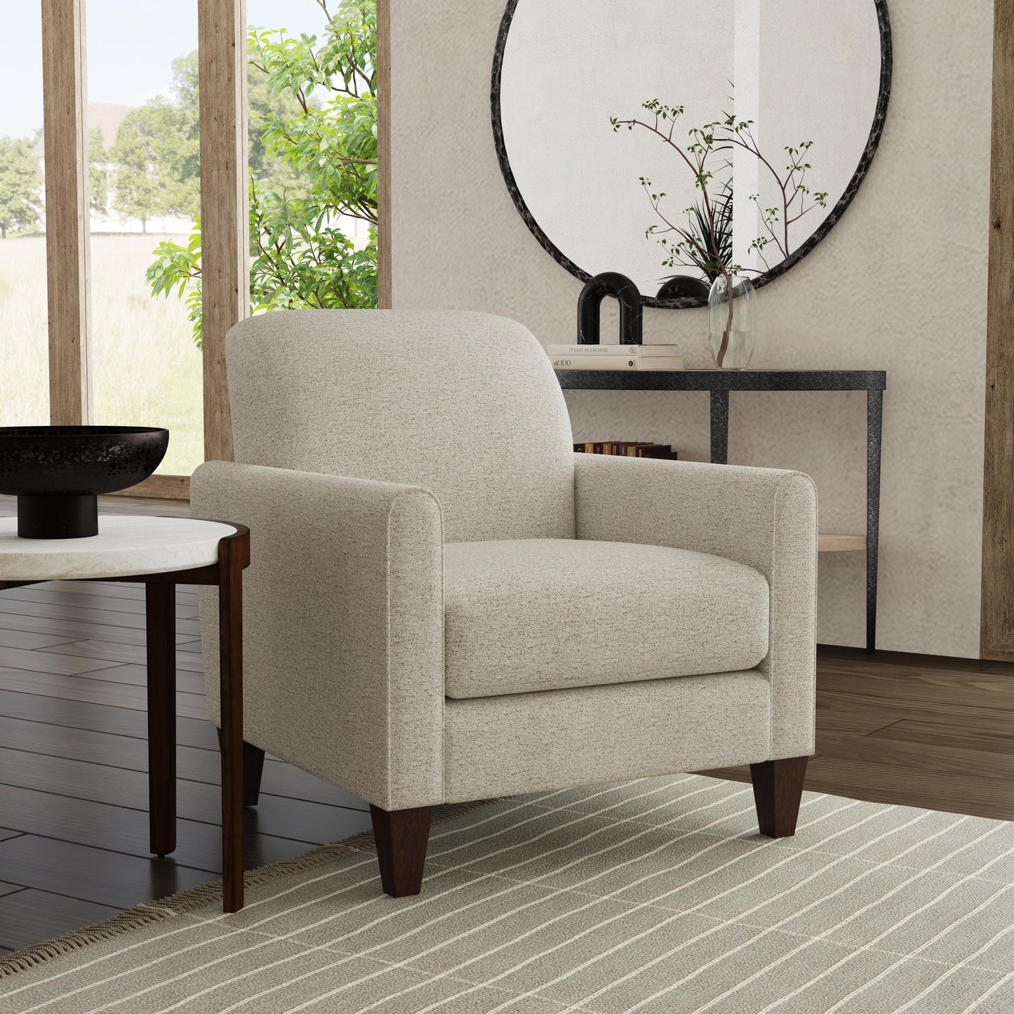 Structured Style. Add a touch of cosmopolitan allure to your living space with the Bond chair. Its sophisticated mid-century style delivers clean lines with a structured tight-back design and refined welt trim. Mailbox-style arms soften the sleek silhouette. Square tapered legs, available in three finishes, and the ability to upholster in your choice of fabrics ensures you achieve the perfect look.