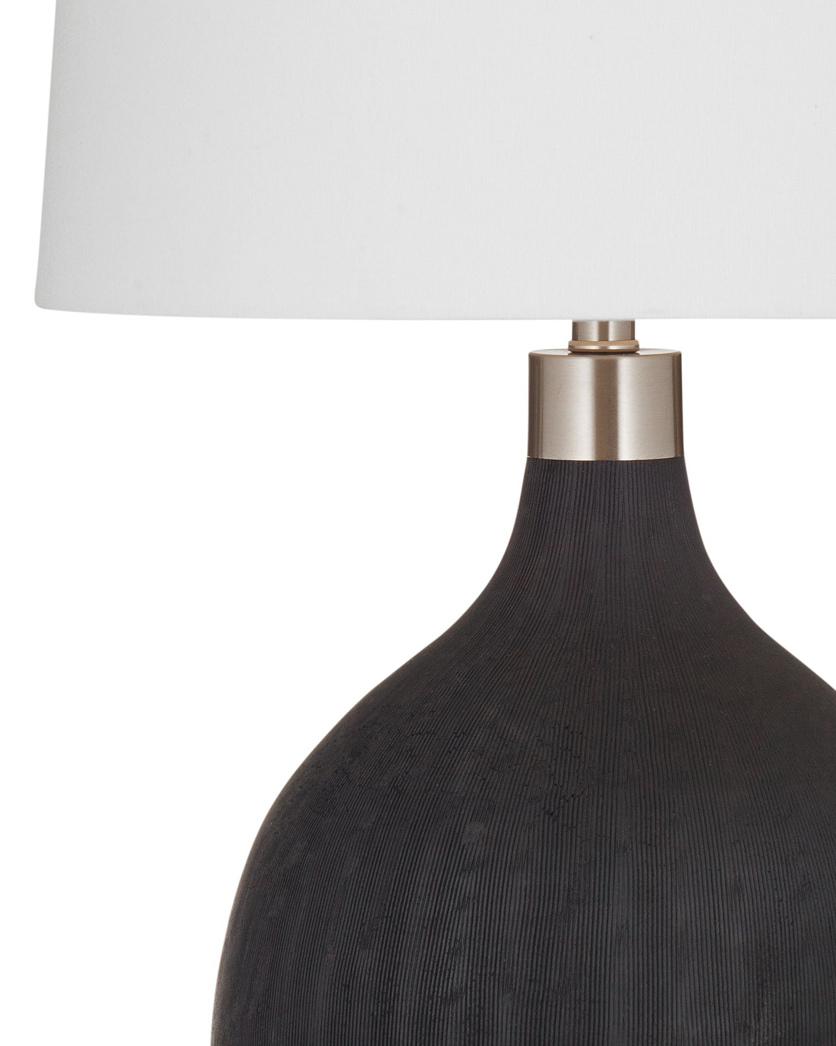 The Boutwell Table Lamp brings bold character to any space with its textured matte black base and sleek silver accents. Paired with a crisp white drum shade, this design balances contrast and sophistication, making it a versatile addition to modern or transitional interiors.