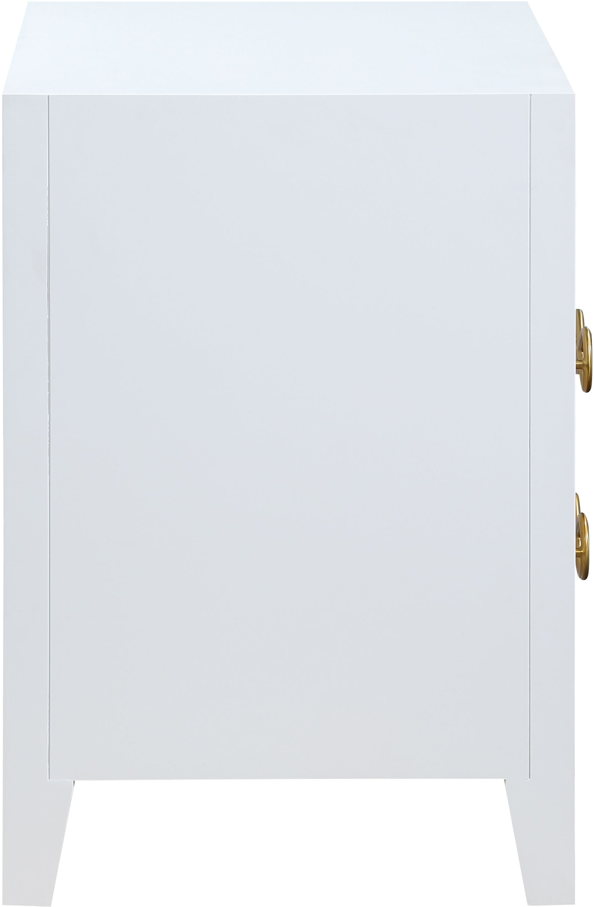 Bring unique elegance to your bedroom with this Bowtie night stand from Meridian Furniture. This night stand features two drawers and a shelf, providing you with plenty of storage space for clothes, linens, or miscellaneous objects. Its light pink color adds a touch of femininity to your living space, and its brushed bow tie handles complement your existing decor. Its flat top is perfect for placing a lamp, framed picture, books, bric-a-brac, and more.