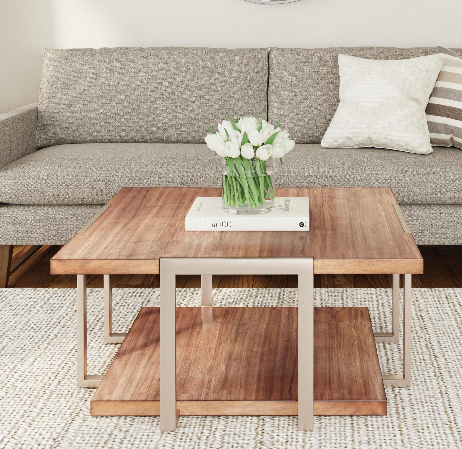 The Brooke Cocktail Table features slick, modern styling with mid-century elements. Inset brushed metal frames support the top and lower shelves, which are finished in a rich brown knotty walnut.