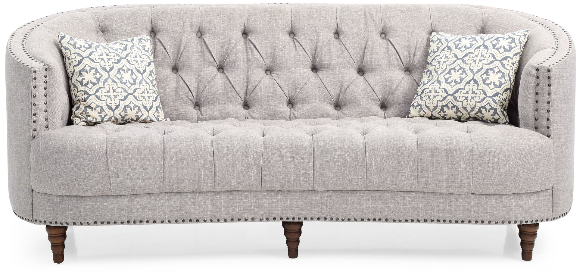 Introducing the charming G850-S sofa in a serene light gray hue, designed to enhance your living space with its retro flair and welcoming comfort. This eye-catching piece features deep tufted fabric on both the inside back and the seat, ensuring a cozy seating experience that's ideal for relaxing moments after a busy day. Its timeless design seamlessly blends with various decor styles, making it a versatile choice for any room. With overall dimensions measuring 36"H X 86"W X 37"D, this sofa provides ample room for relaxation while maintaining a compact form that fits beautifully in your home. Constructed with premium materials, this sofa stands ready to be the centerpiece of your living area while offering comfortable support and a touch of sophistication. Its stylish appearance is complemented by thoughtful details such as antiqued nail heads and coordinated throw pillows, adding to the overall charm. This sofa is more than just a piece of furniture; it's an invitation to gather and share moments with family and friends.