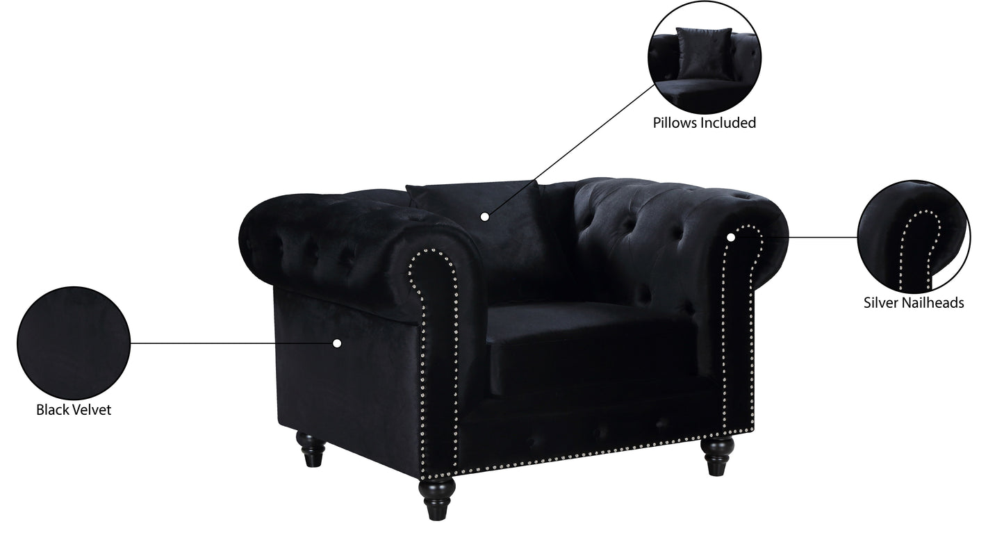 Elegant and eye-catching, the stunning Chesterfield Living Room from Meridian Furniture is the perfect addition to any space. covers the plush, comfortable seat, padded with high-density foam and modern tufted design. Strength and beauty is guaranteed with a solid wood frame and legs. Features a nail head design on the arms and includes matching throw pillows.