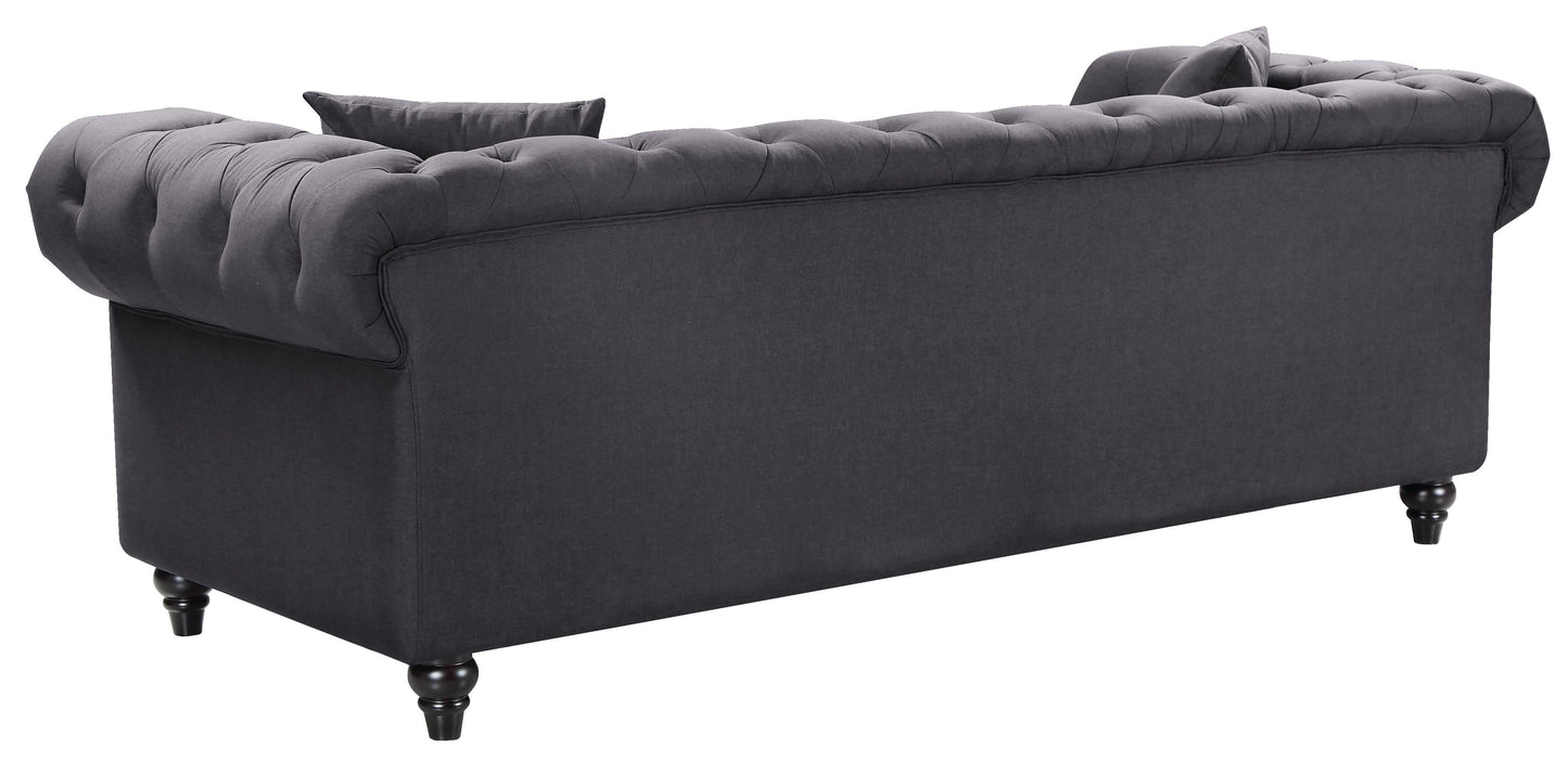 Elegant and eye-catching, the stunning Chesterfield Living Room from Meridian Furniture is the perfect addition to any space. covers the plush, comfortable seat, padded with high-density foam and modern tufted design. Strength and beauty is guaranteed with a solid wood frame and legs. Features a nail head design on the arms and includes matching throw pillows.