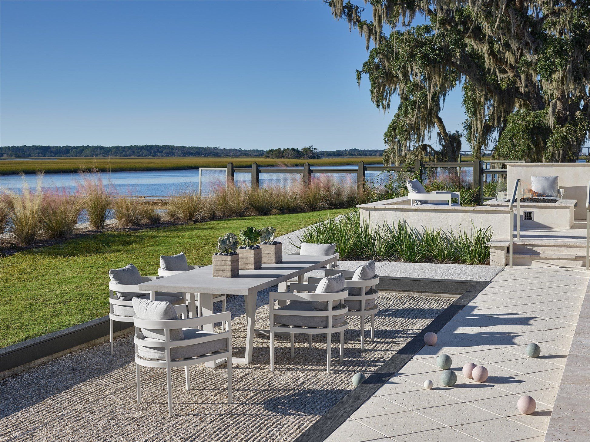 The South Beach Dining Chair introduces a casual elegance to outdoor dining spaces with light gray seat cushions perfectly complemented by a fresh white-hued aluminum body with subtle curvature.