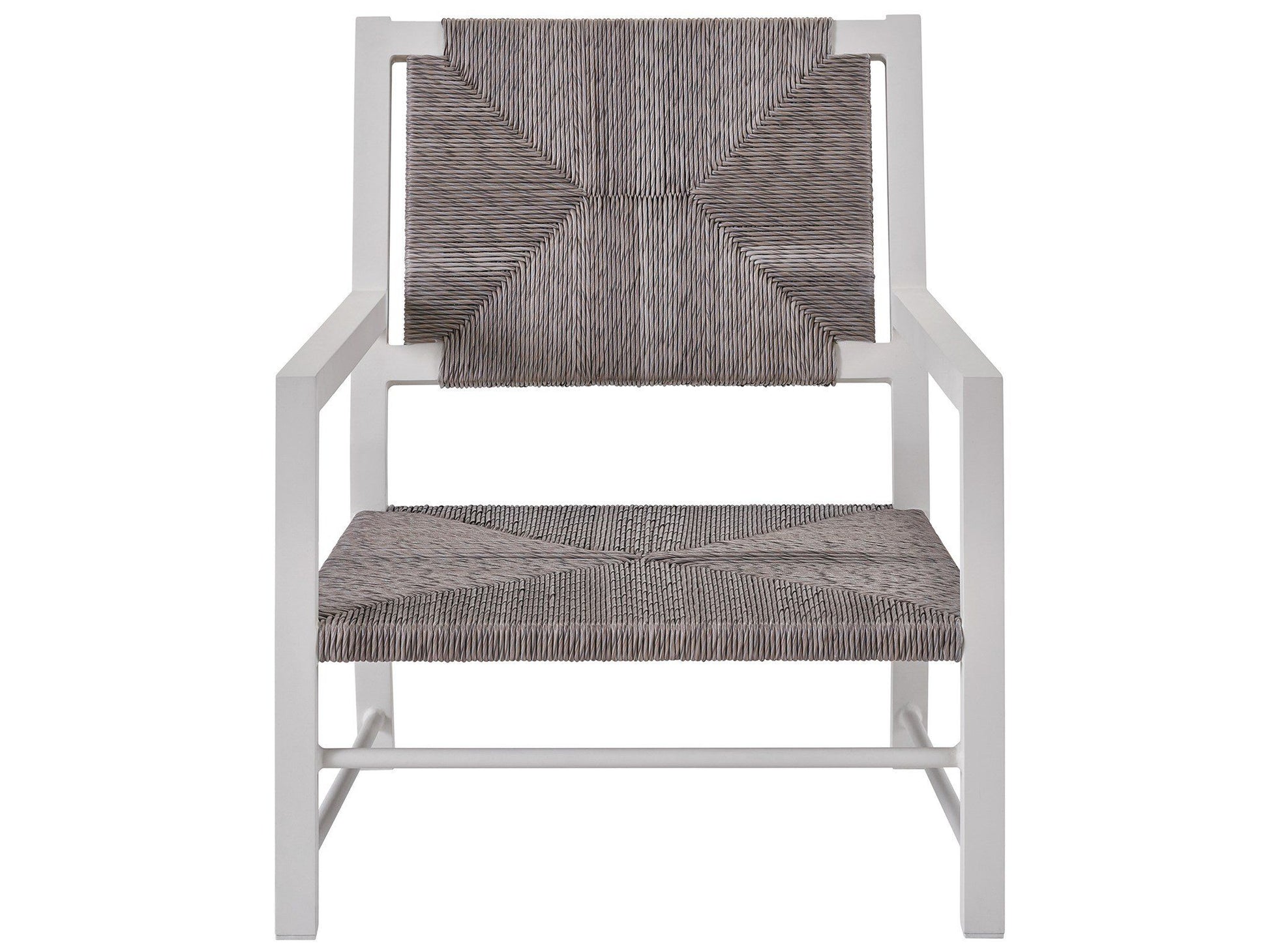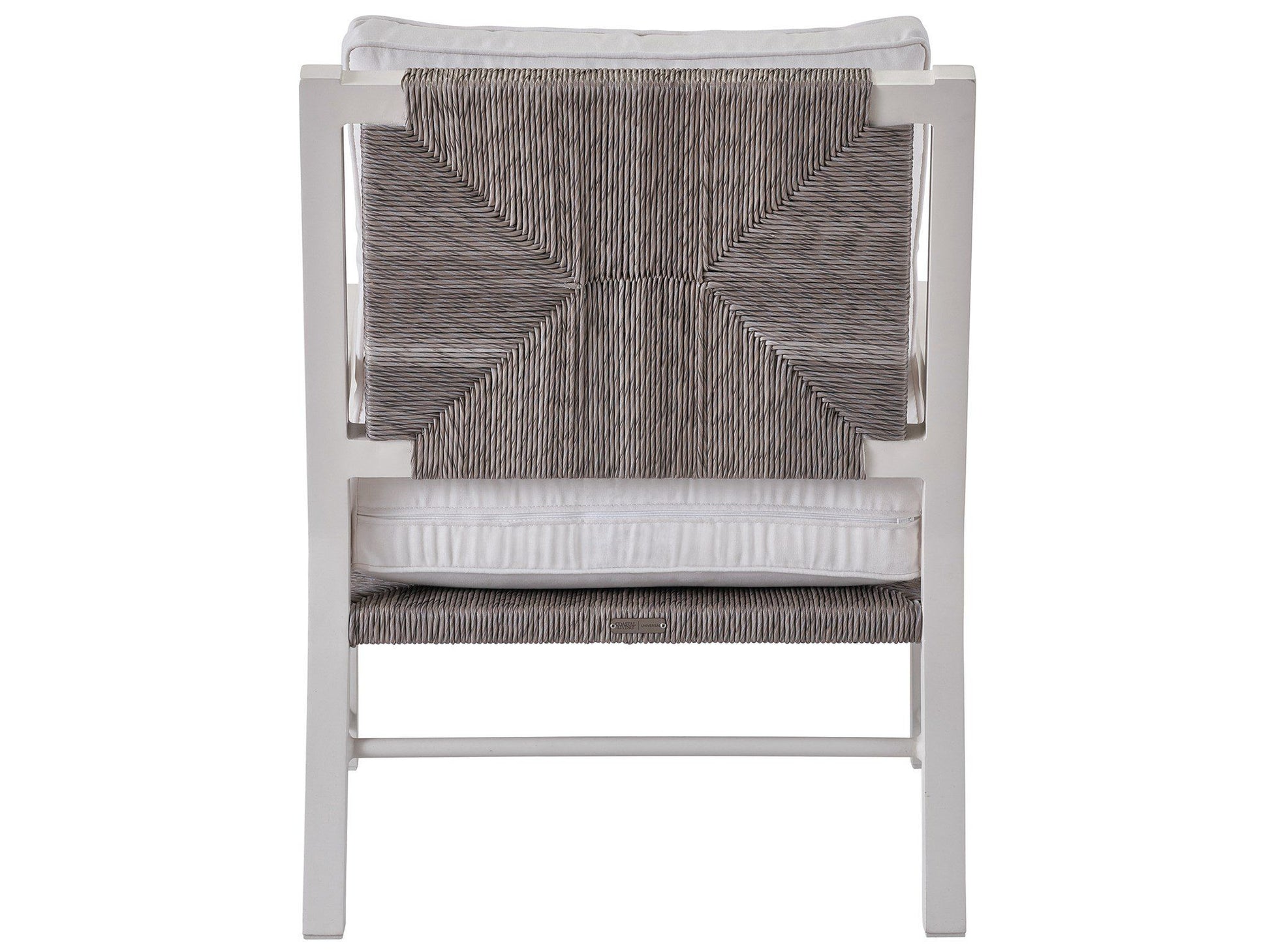 Modern with a touch of coastal flair, the Tybee Lounge Chair includes greige wicker detailing, a crisp white frame, and plush upholstered cushions.