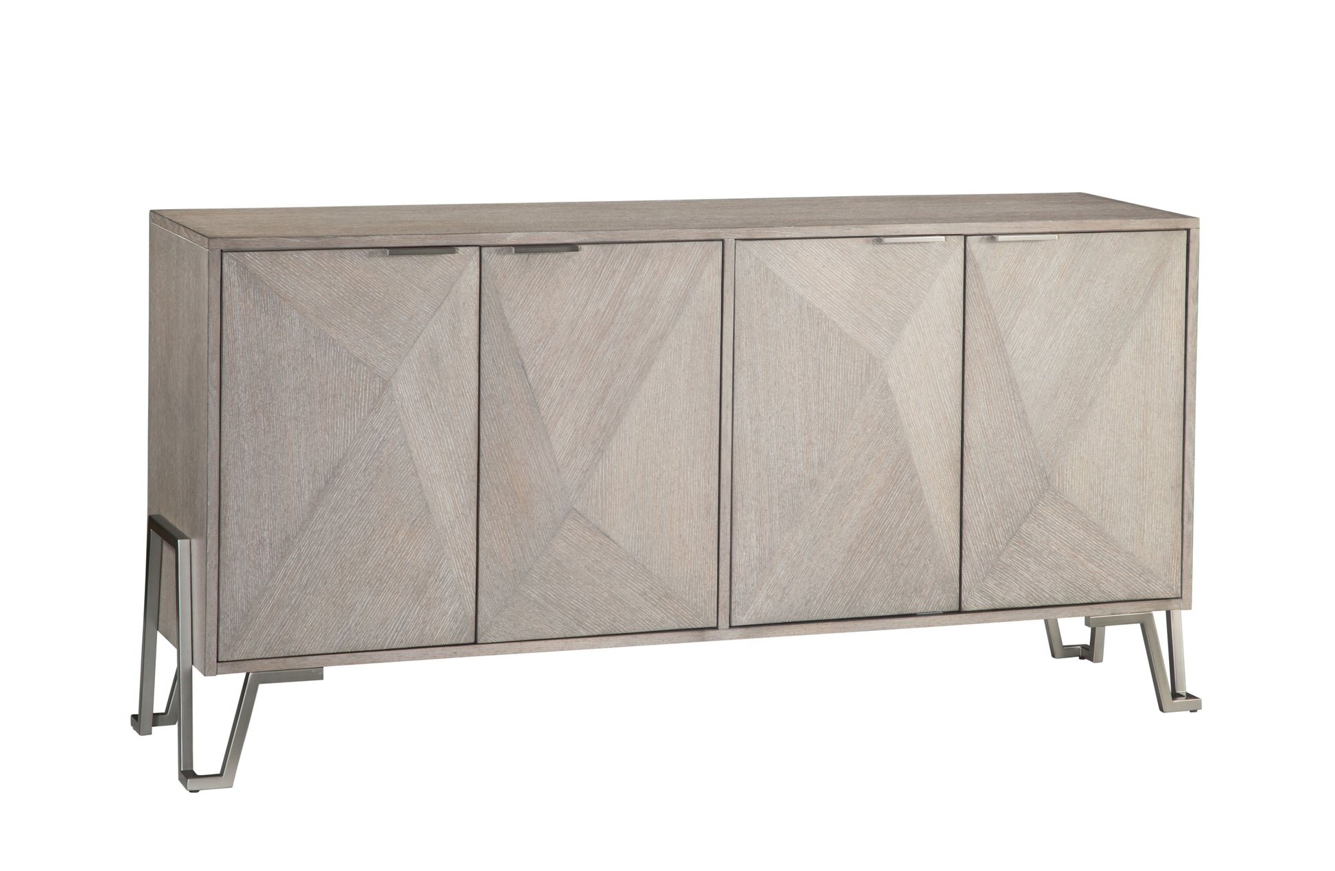 The Cooper Server features a modern transitional design enhanced by raised angular door fronts with veneers in alternating directions. The base hugs the sides of the case frame and is in brushed nickel with coordinating tab pulls. This server offers two adjustable shelves and media cord management. Finished in a light gray cerused oak, accented with brushed nickel door pulls and feet.