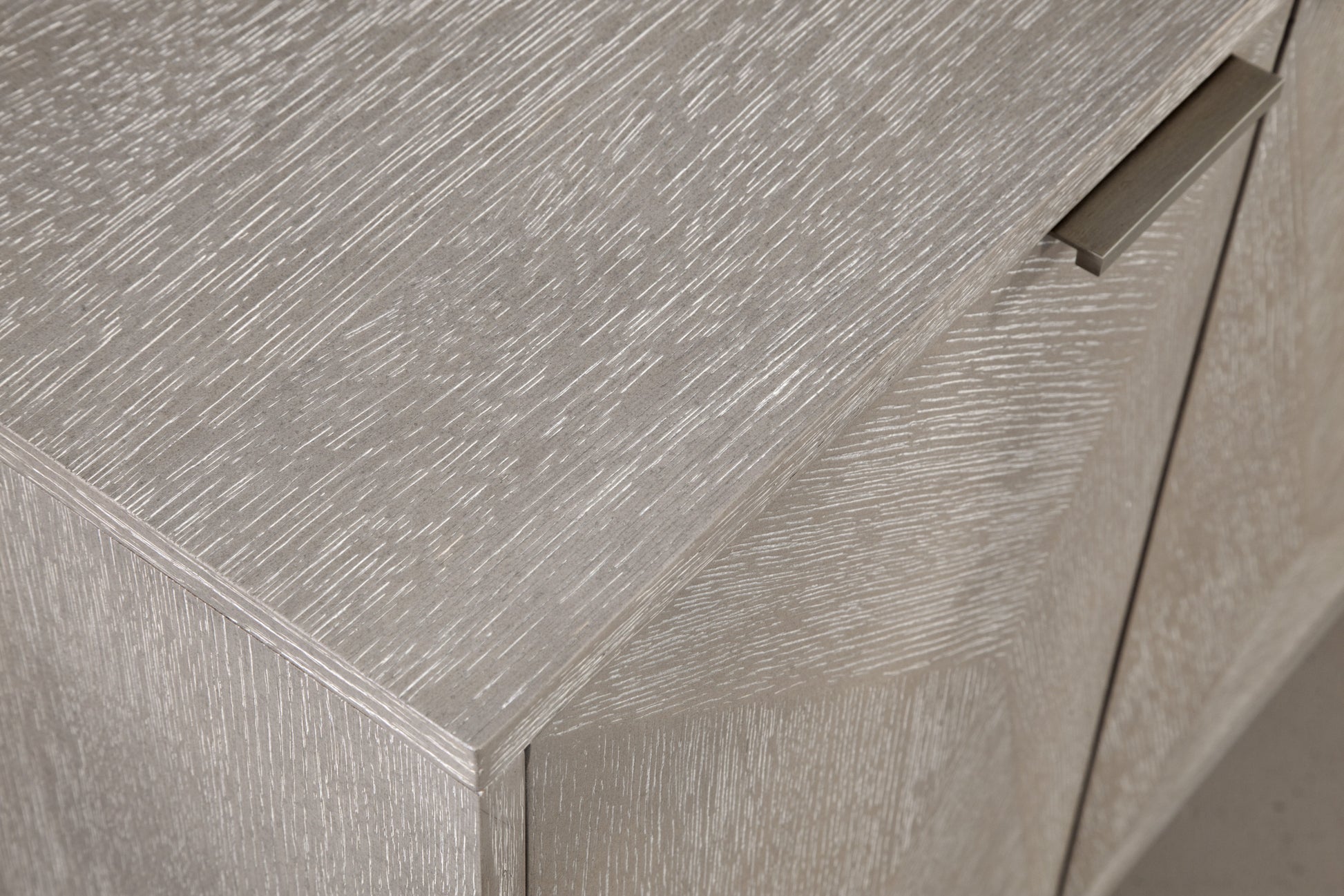 - Features a light gray cerused quartered oak veneer finish