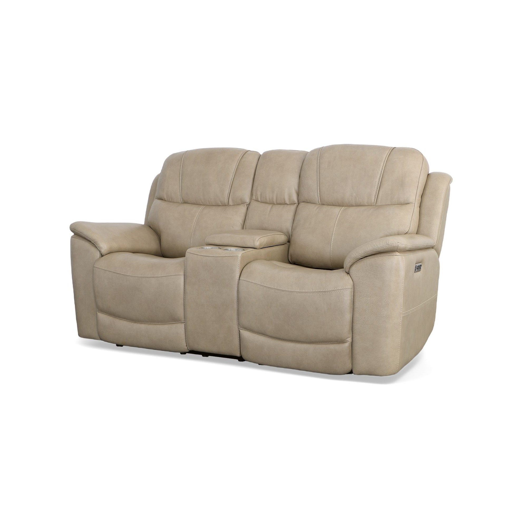 Superior ergonomics combine with the plush comfort of the Crew leather power reclining loveseat with console. Featuring triple power functionality that allows for independent adjustment of the headrests, lumbar supports and recline, this loveseat also features Zero Gravity which reduces pressure and tension on the body. Enjoy reliable comfort all day, every day, with pad-over armrests, waterfall chaise footrests, thin layered headrests, and divided back cushions. Built-in USB ports conveniently charge mobile devices while a center storage console keeps remotes and beverages nearby so you can settle in for a marathon movie night. With Flexsteel's patented Blue Steel Spring™ at the heart of each seat, and high-quality light tan leather, the Crew power reclining loveseat brings exceptional beauty and durability to your home.