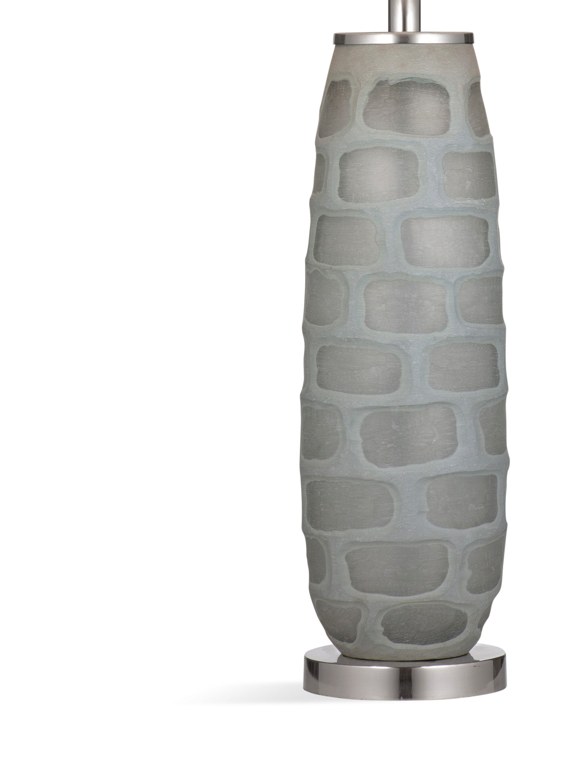 The DePauTable Lamp is crafted of glass with silver accents and a drum shade.
