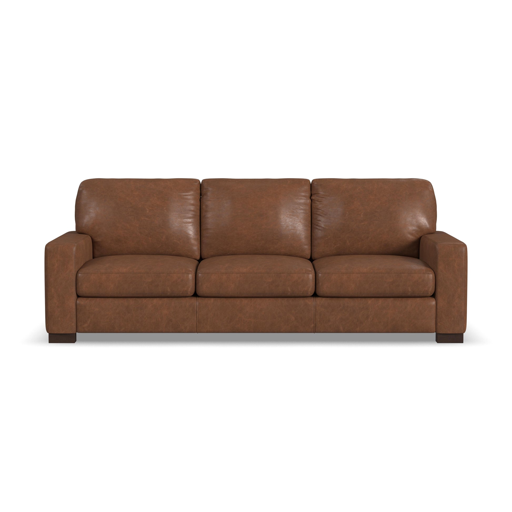 Enduring comfort and timeless transitional style are the hallmarks of the Endurance sofa. Featuring a low, relaxed look with deep seats and wide track arms, this inviting piece welcomes everyone to hang out and lounge. Fully upholstered in a chestnut top-grain leather with distinct character, and anchored with dark wood square block legs, the Endurance sofa offers a luxe look designed to stand the test of time in both look and function.