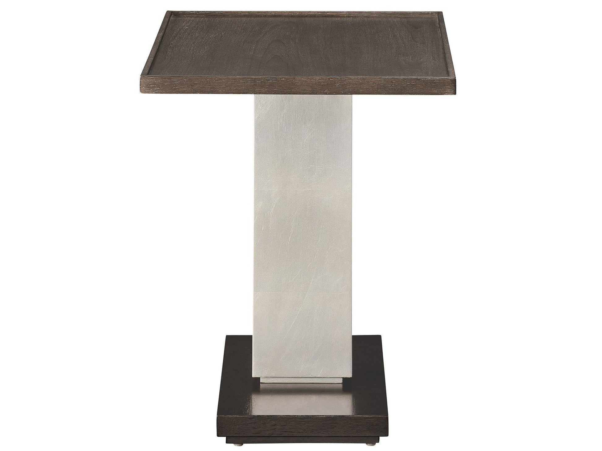 A shimmering silver leaf pedestal connects a dark walnut base to a light walnut top in this intriguing abstract side table.