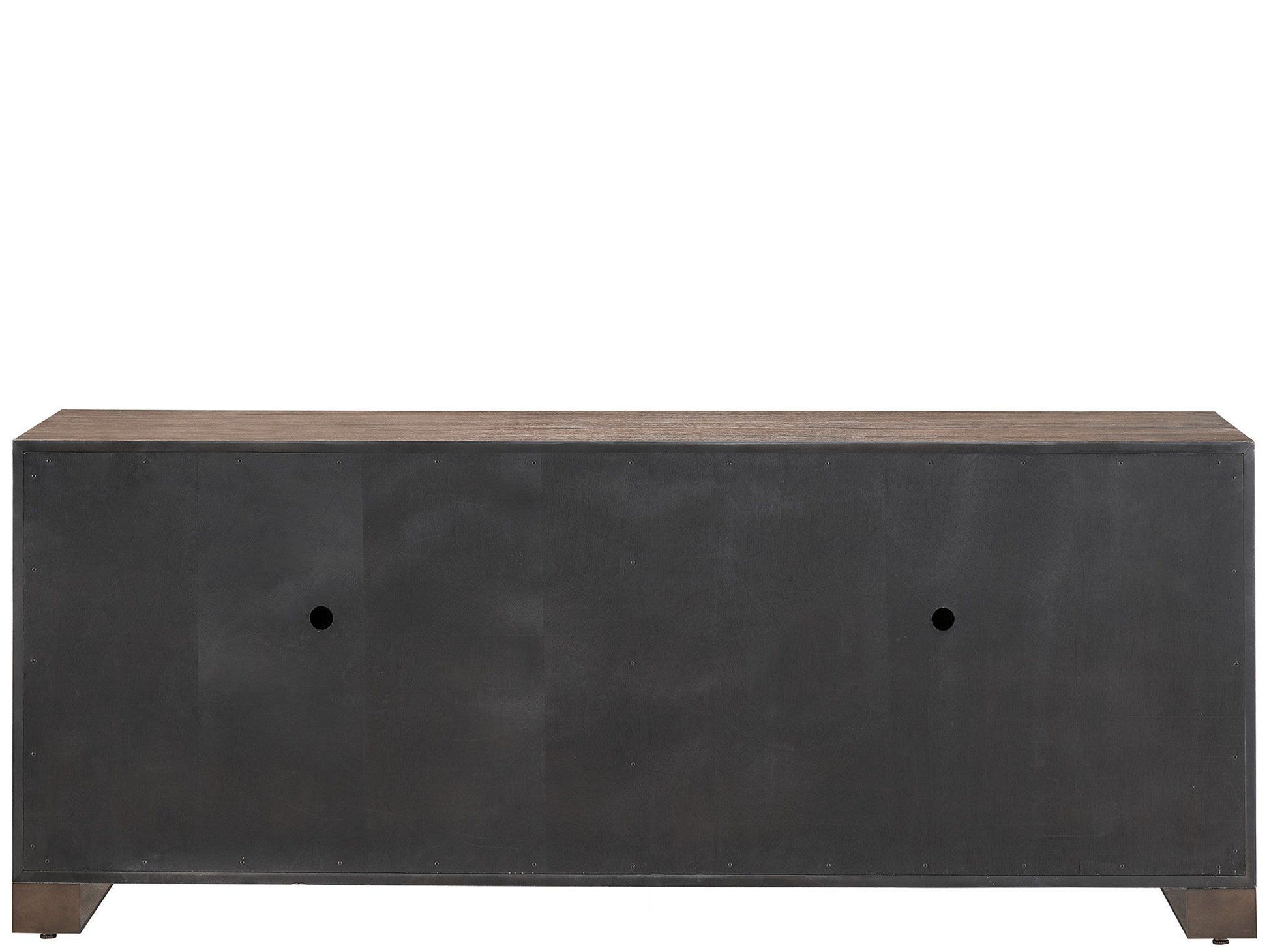 The gilded sandblasted oak doors add a touch of accessible luxury to the dark walnut veneer and satin bronze accents on this spacious console.