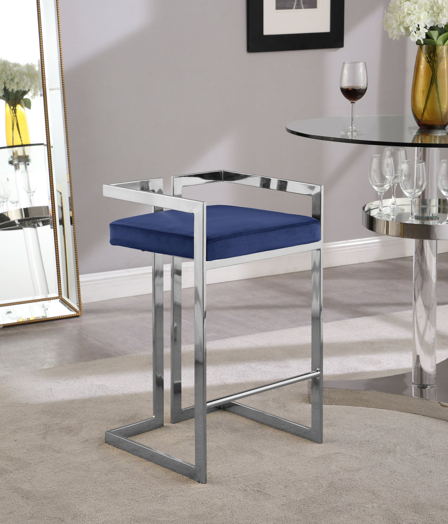 Count on the Ezra Counter Stool to make a big impression in your home bar area or at the kitchen counter. The modern shape, with its clean lines and bold-finished steel base give this stool a contemporary slant that's just the thing for up-to-the-minute decor settings. The seat of this stool is upholstered in rich velvet material for lavish comfort and a sensuous feel against the skin. The counter-height footprint ensures the stool works in a number of applications.