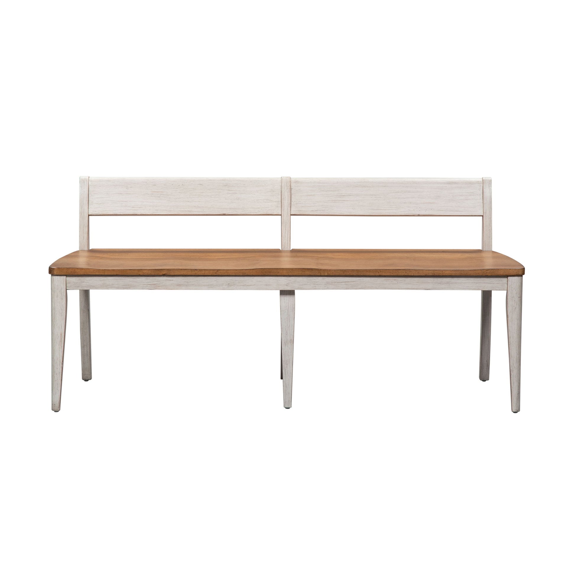 Sit in comfort and style with the Farmhouse Reimagined bench. Crafted of rubberwood solids, this piece features a timeless antique white finish with a chestnut seat, a curved seat and seat back for added comfort, nylon chair glides to protect your flooring, and is anchored by beautifully tapered legs. This piece offers a look that compliments today's homes with style uncompromised and comfort abound.