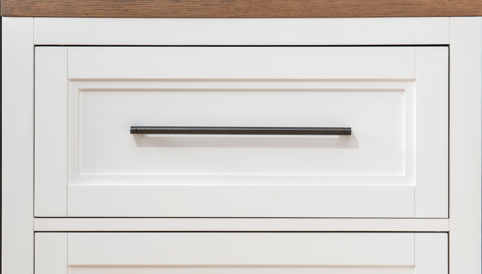 Tactile,, yet refined,, and always modern. Clean lines meld with comfortable textures and tones in our total home collection,, Franklin. Simple farmhouse details such as block feet,, beveled framed drawer fronts,, planking and X motifs create visual interest in a modern way and without feeling too cluttered. Harvest Oak tops on quartered white oak veneer sit atop Natural White painted bases. Select items offered in Aged Black that repeats the finish on hardware and accents.