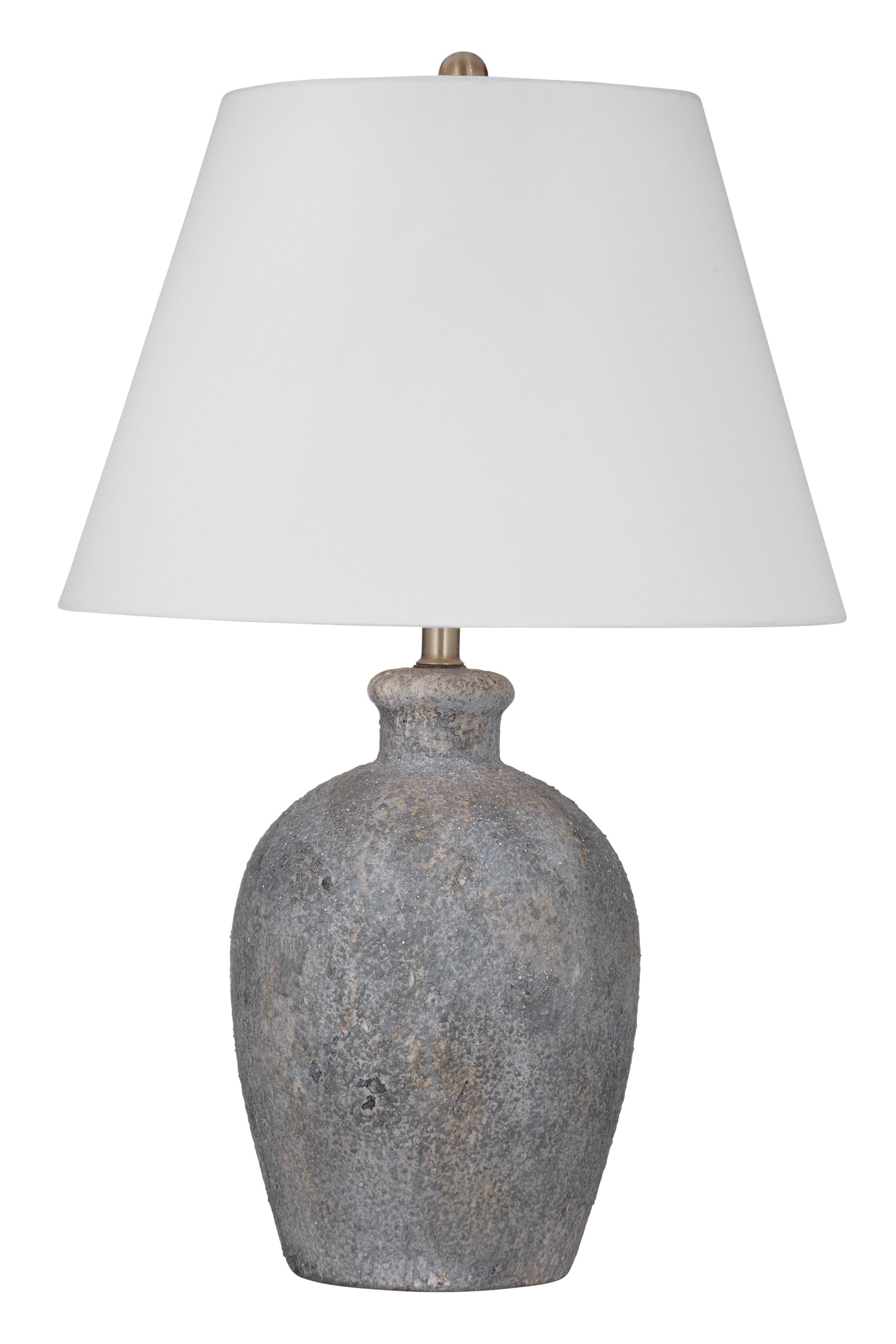 The Fremont Table Lamp is a nod to traditional design with its ceramic lamp body, featuring a textured surface that resembles the look of natural stone. The classic urn shape of the lamp base is time-honored, yet the weathered gray finish adds a contemporary rustic charm. It's complemented by a simple white lampshade that directs light downwards for a cozy, ambient glow, perfect for adding a sense of warmth to any space. This lamp's design brings a touch of old-world craftsmanship into the modern home.