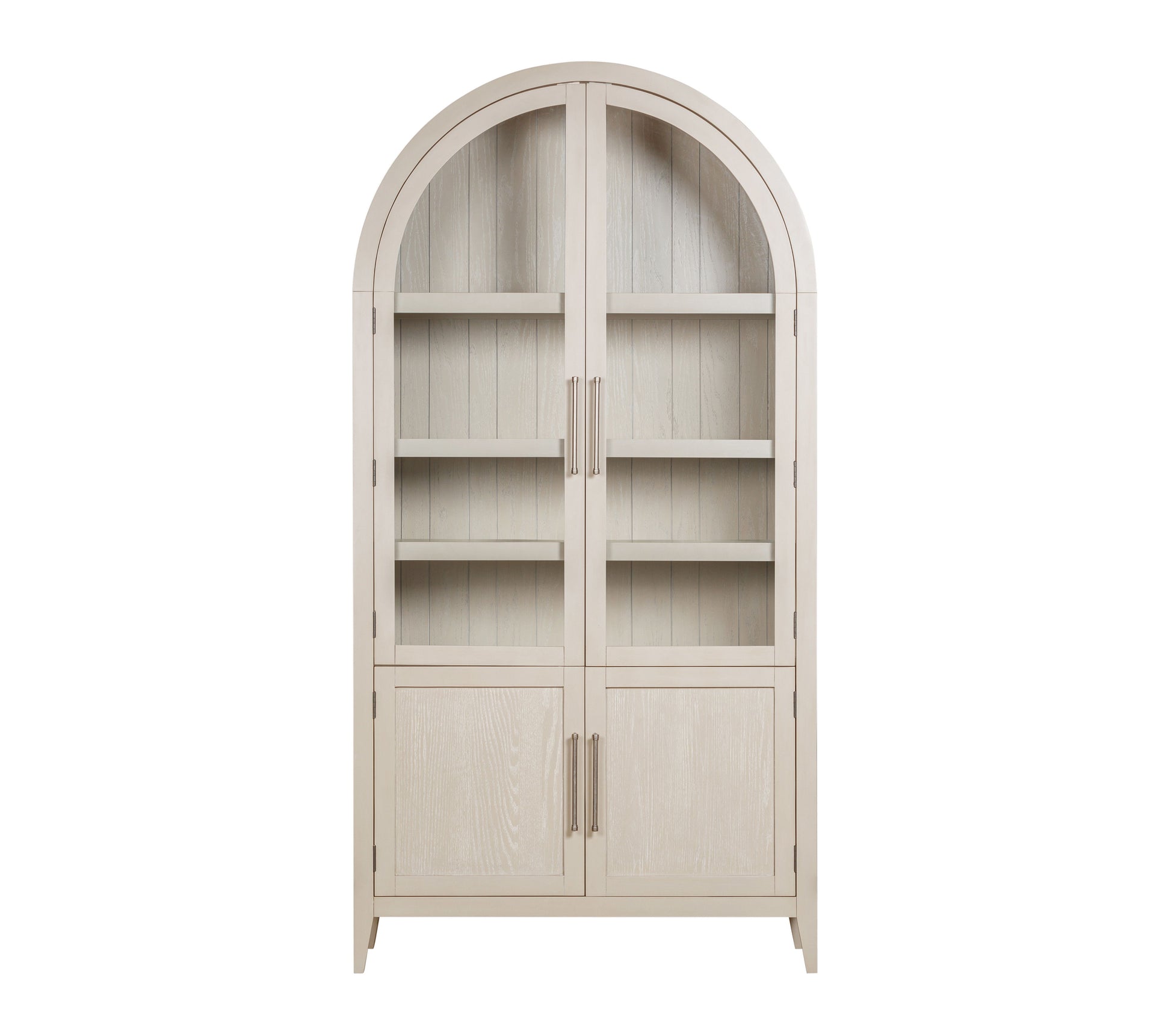 The Fynn Light Oak Display Cabinet beautifully merges modern and traditional design elements. Constructed from solid wood and flat-cut oak veneers, it features a refined cerused grey-oak finish. The cabinet showcases two arched, oversized doors that open to reveal three adjustable shelves, perfect for showcasing your favorite items. Below, a single adjustable shelf provides additional storage, elegantly accented by antique nickel-finished bar pulls. This versatile piece adds both style and functionality to any room.