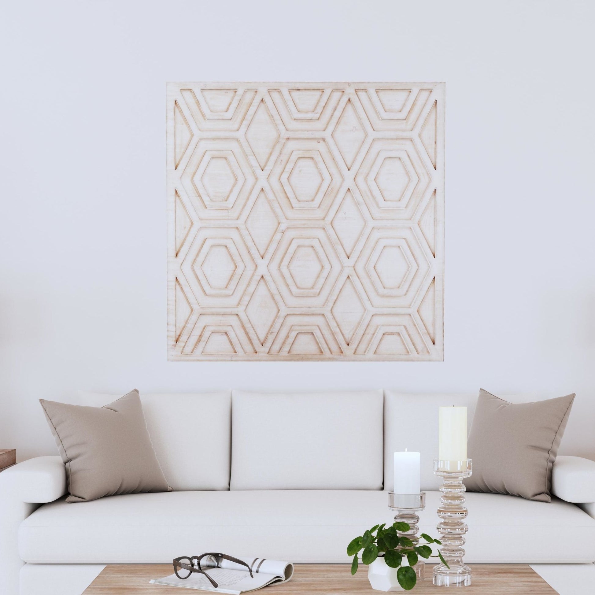 The Geometric Wall Art features white washed wood with geometric cut out designs. This large scaled contemporary art piece is designed to be hung on the wall, and will make a statement in any room in the house.