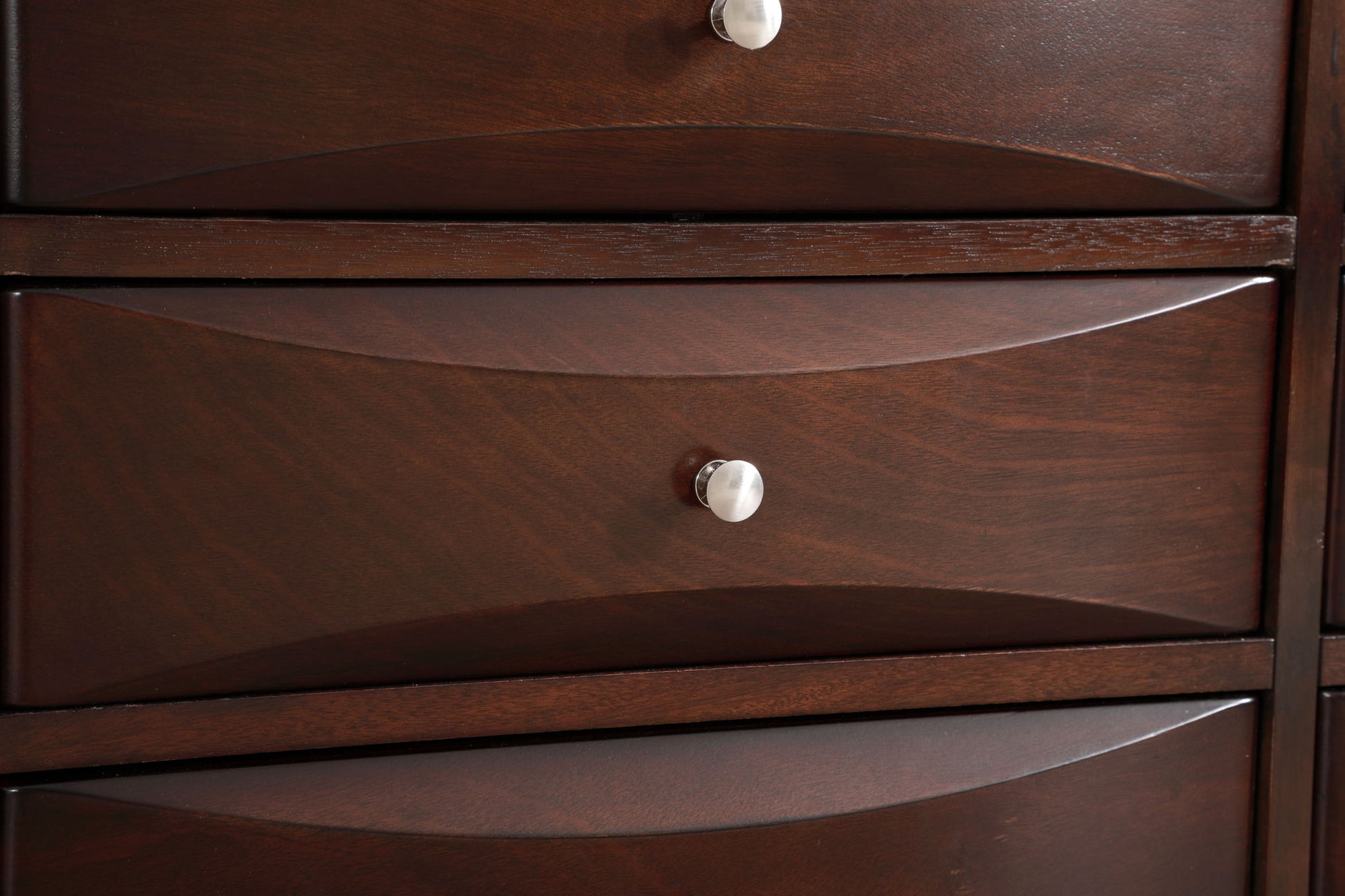 This chest is ideal for tighter spaces, maximizing storage without sacrificing floor area. Nickel hardware enhances the aesthetic while ensuring dependable operation. The sleek beveled drawer fronts promote a refined look and enhance user experience, making organization simple and efficient. Each spacious drawer, with dimensions of 17 inches wide, 13 inches deep, and 4 inches high, provides ample space for storing a variety of items, keeping your entertainment area tidy and well-ordered.
