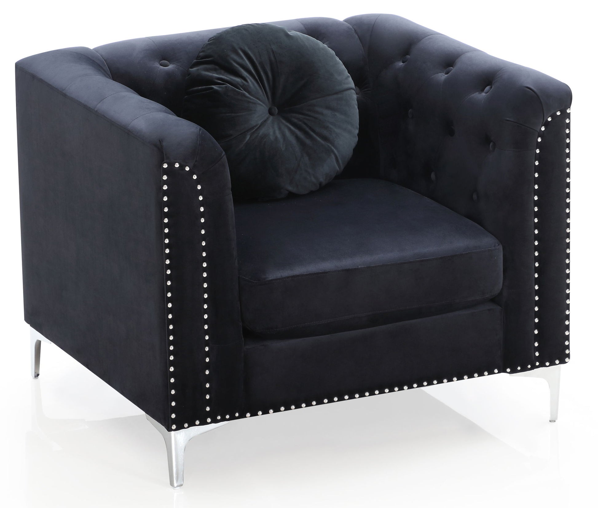 The chrome legs and decorative nailhead trim contribute to a modern aesthetic, ensuring the chair stands out as a stylish focal point in your room. With overall dimensions of 31"H x 38"W x 34"D, it is ideally sized to fit snugly in various spaces, making it a practical choice for compact apartments or larger homes alike.