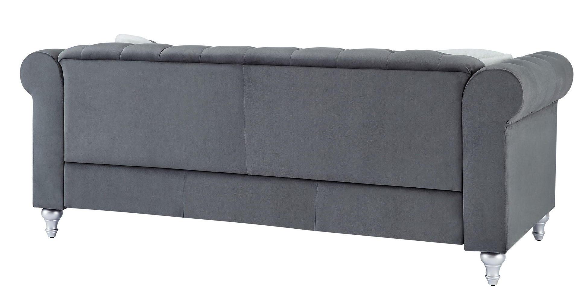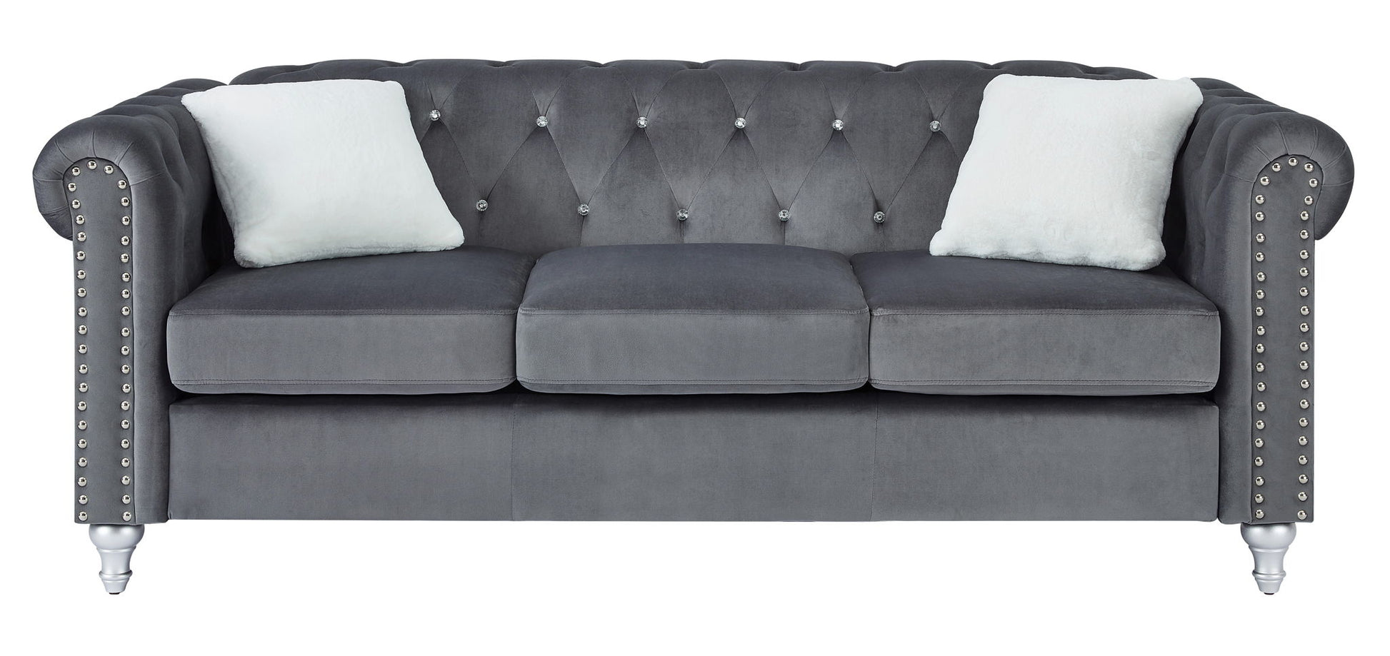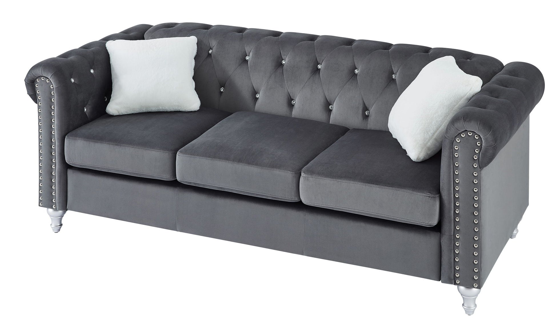 The soothing tone seamlessly complements an array of decor styles, while the jeweled tufted micro suede velvet cover introduces a rich, tactile texture that encourages relaxation and comfort. It stands as a focal point in any room, inviting gatherings and conversation.