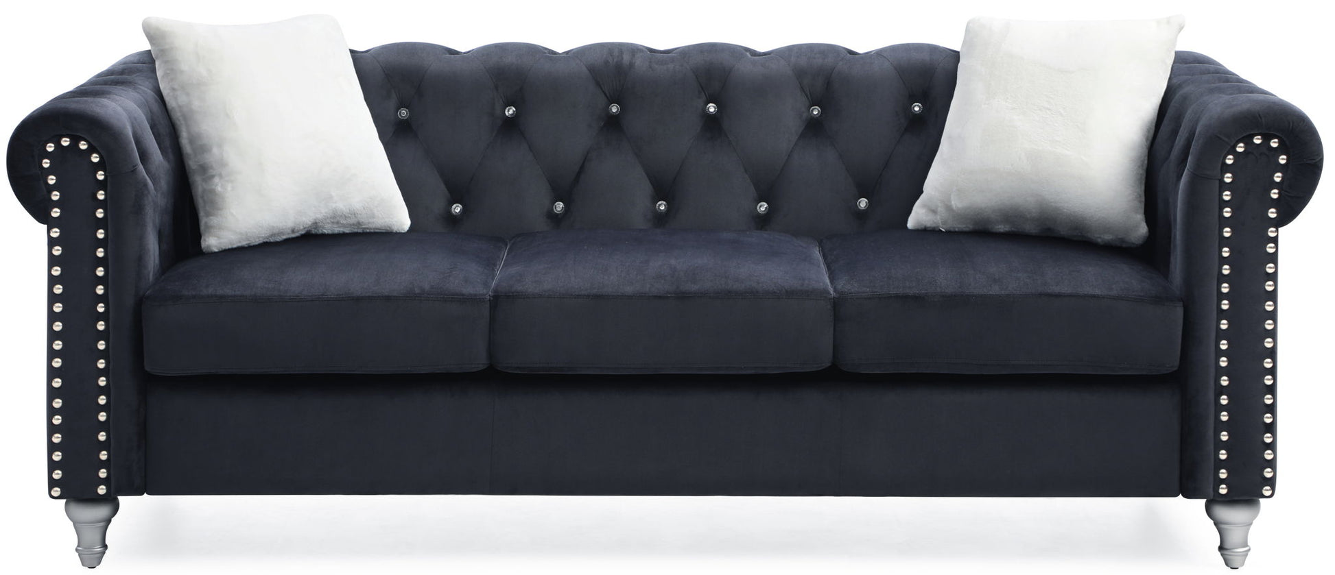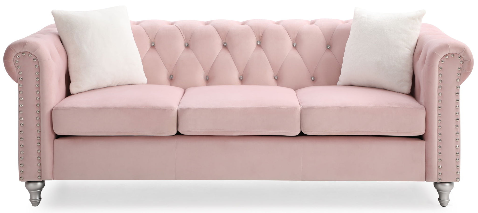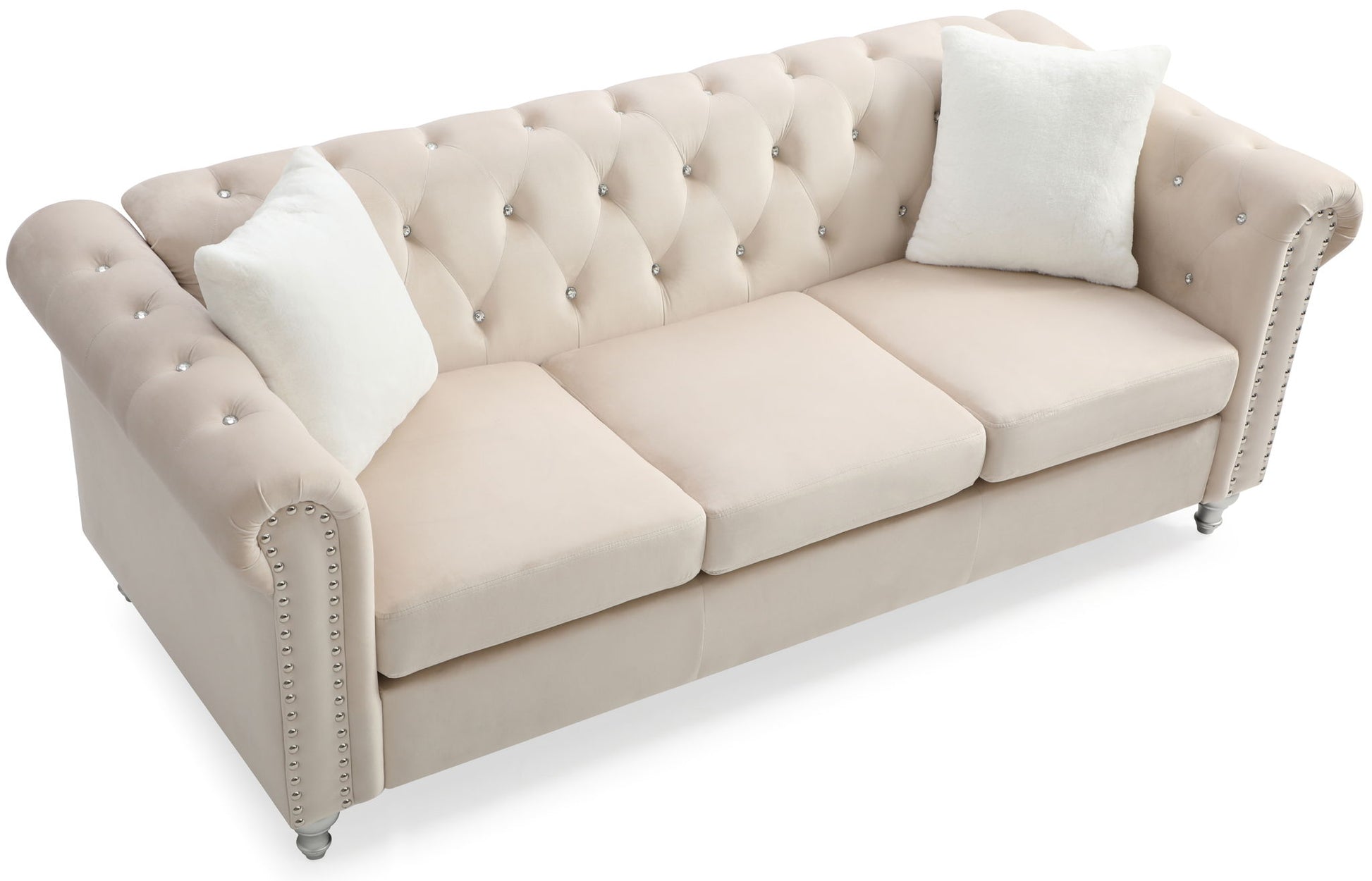 The soothing tone seamlessly complements an array of decor styles, while the jeweled tufted micro suede velvet cover introduces a rich, tactile texture that encourages relaxation and comfort. It stands as a focal point in any room, inviting gatherings and conversation.