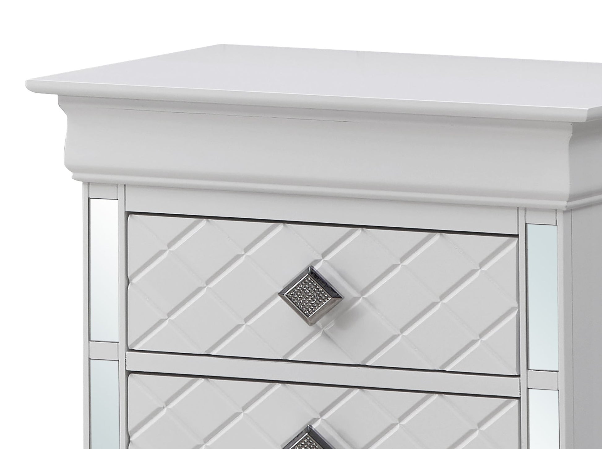 Discover the combination of functionality and aesthetics with this nightstand. Dressed in a stunning Metallic finish, it brings a contemporary flair to your bedroom while offering essential storage solutions. The eye-catching chrome pulls, embellished with faux crystals, not only enhance the visual appeal but also provide ease of access to the drawers.