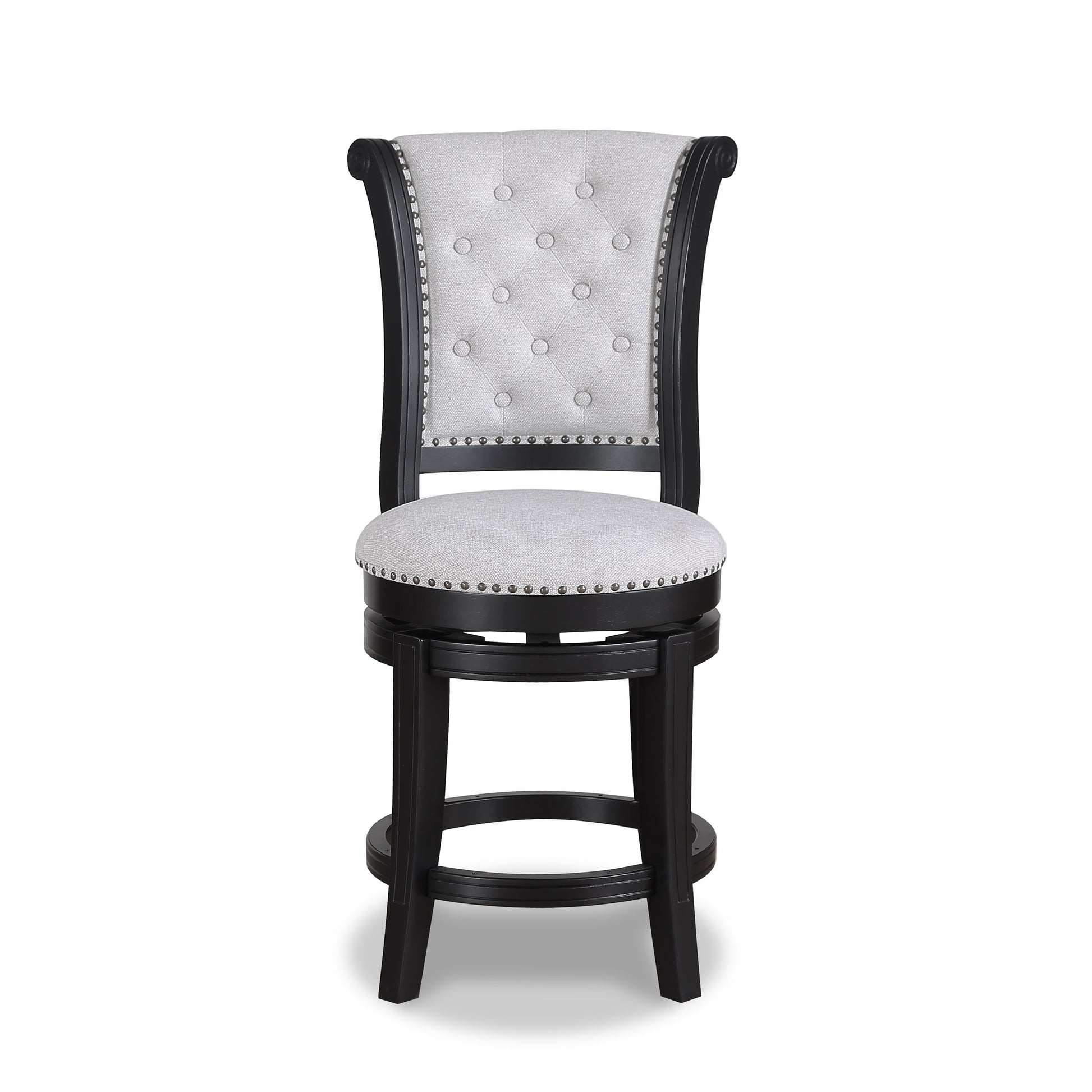 The Granville Swivel stool is beautifully crafted. With a button tufted full height back, nail head trim detail, and cushioned upholstered seat, it provides a classic look that adds a touch of sophistication to your space. Upholstered in a rich espresso vinyl, it is not only visually appealing but easy to care for. A 180 degree swivel and wood footrest offer accessibility and comfort. Full assembly required.