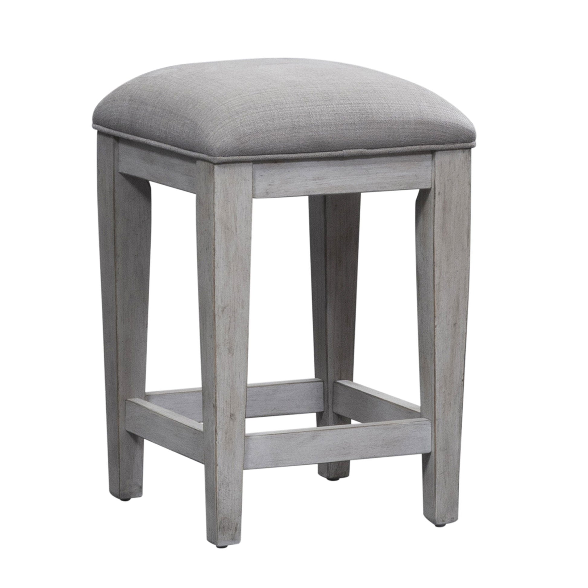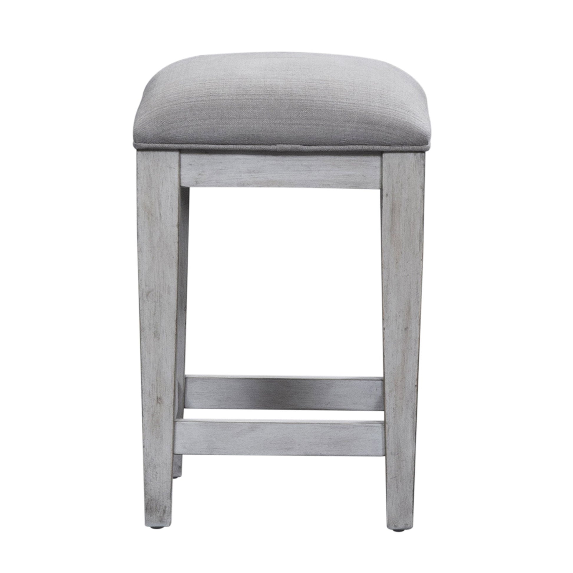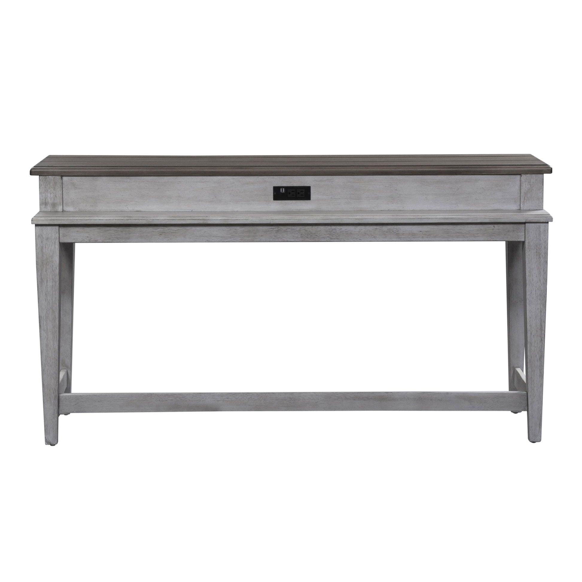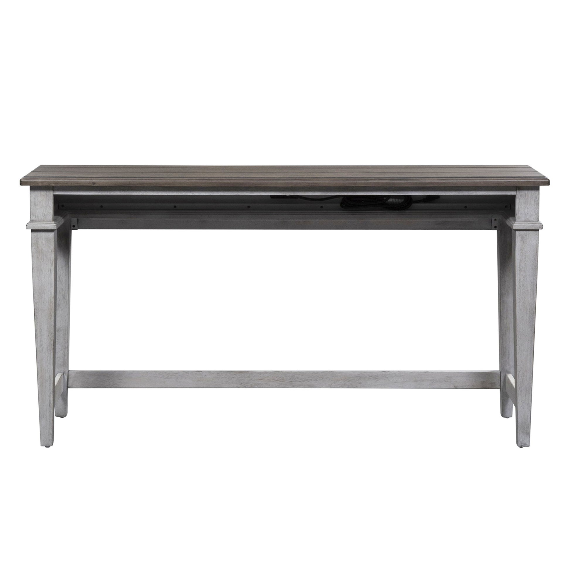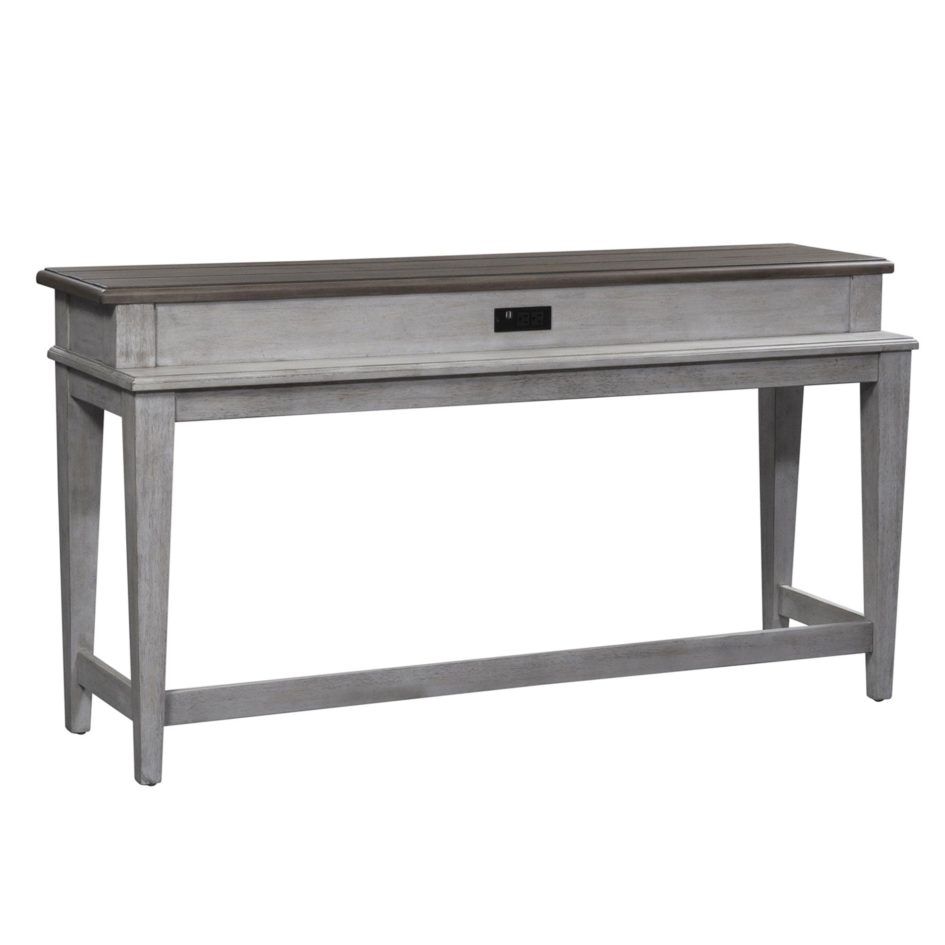 Heartland collection is a step back in time to a charming vintage farmhouse. Crafted of rubberwood solids with cathedral white oak veneers in an antique white finish with a tobacco top. Features planked top, square tapered legs and two power outlet and two USB ports. Console stools offer cushioned upholstered seat in a grey taupe fabric. Perfect for behind your sofa or in a kitchen nook. This style will complement any décor from cottage to traditional. Kit consists of console bar table and three console stools.