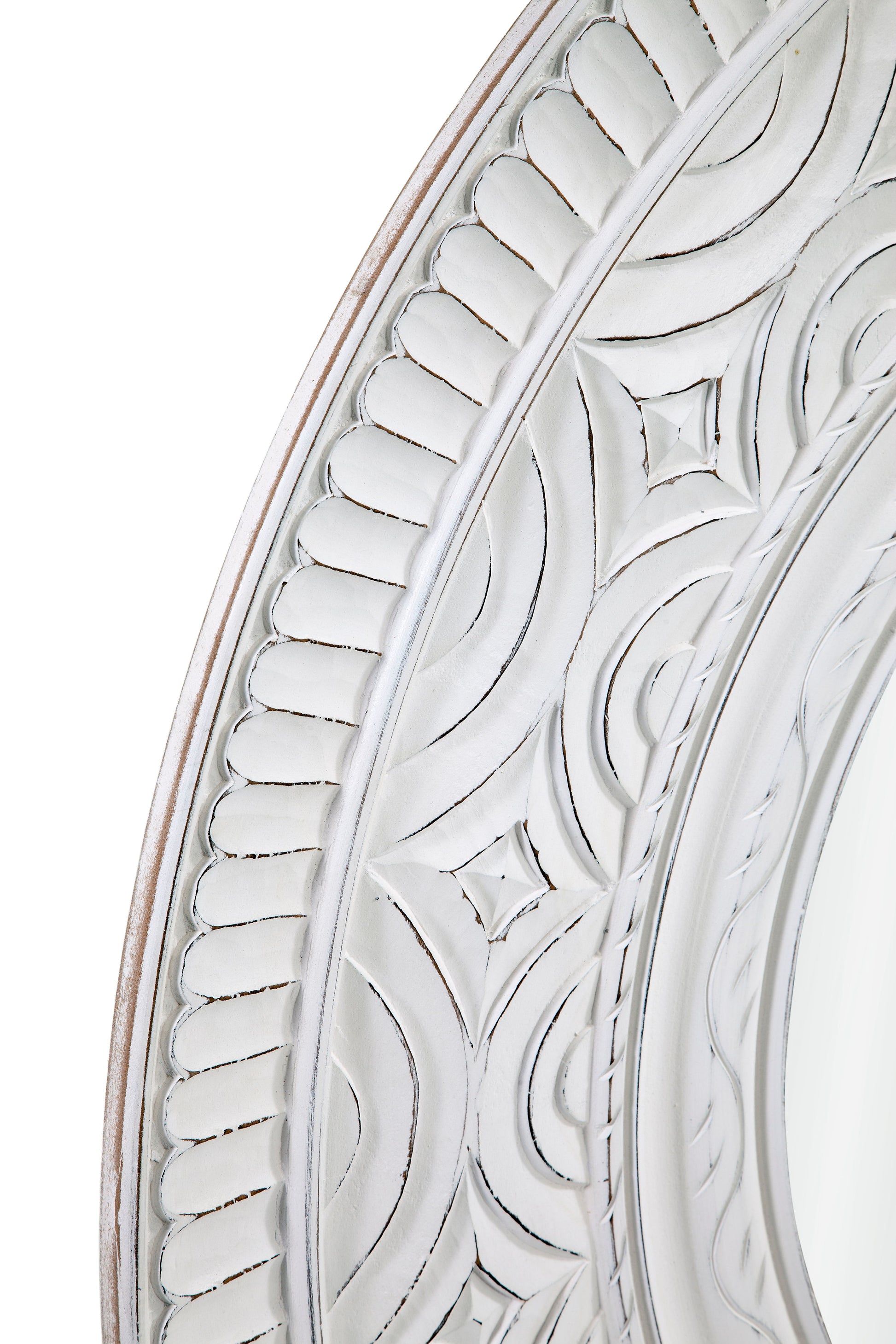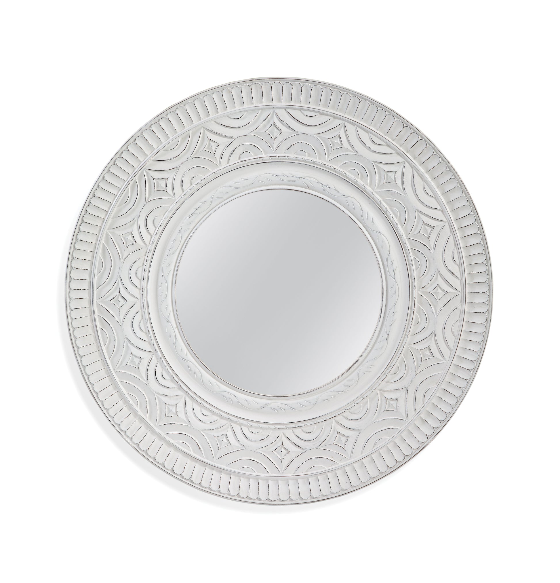 The Holland Wall Mirror is a round mirror with a large carved chalky distressed white frame.