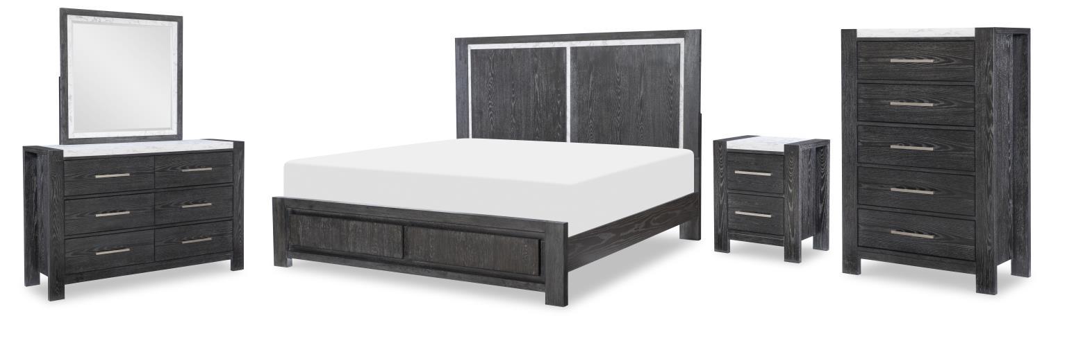 Casual elegance meets refined detail with the 5031 Horizons bedroom. The rich Espresso finish highlights the transitional appeal of oak veneer and select hardwood solids,, while modern design elements lend a fresh,, elevated touch to the bedroom. Marble laminate tops on the cases provide a cool contrast to the deep wood tones. Brushed nickel hardware pops against the dark finish. The panel headboard and dresser mirror feature marble laminate accents,, adding visual interest and tying into the case design. Designed with thoughtful craftsmanship,, drawers are built with French dovetail construction and ball bearing metal side glides,, offering smooth,, quiet function and quality. The bed is offered in twin,, full,, queen and king sizes.