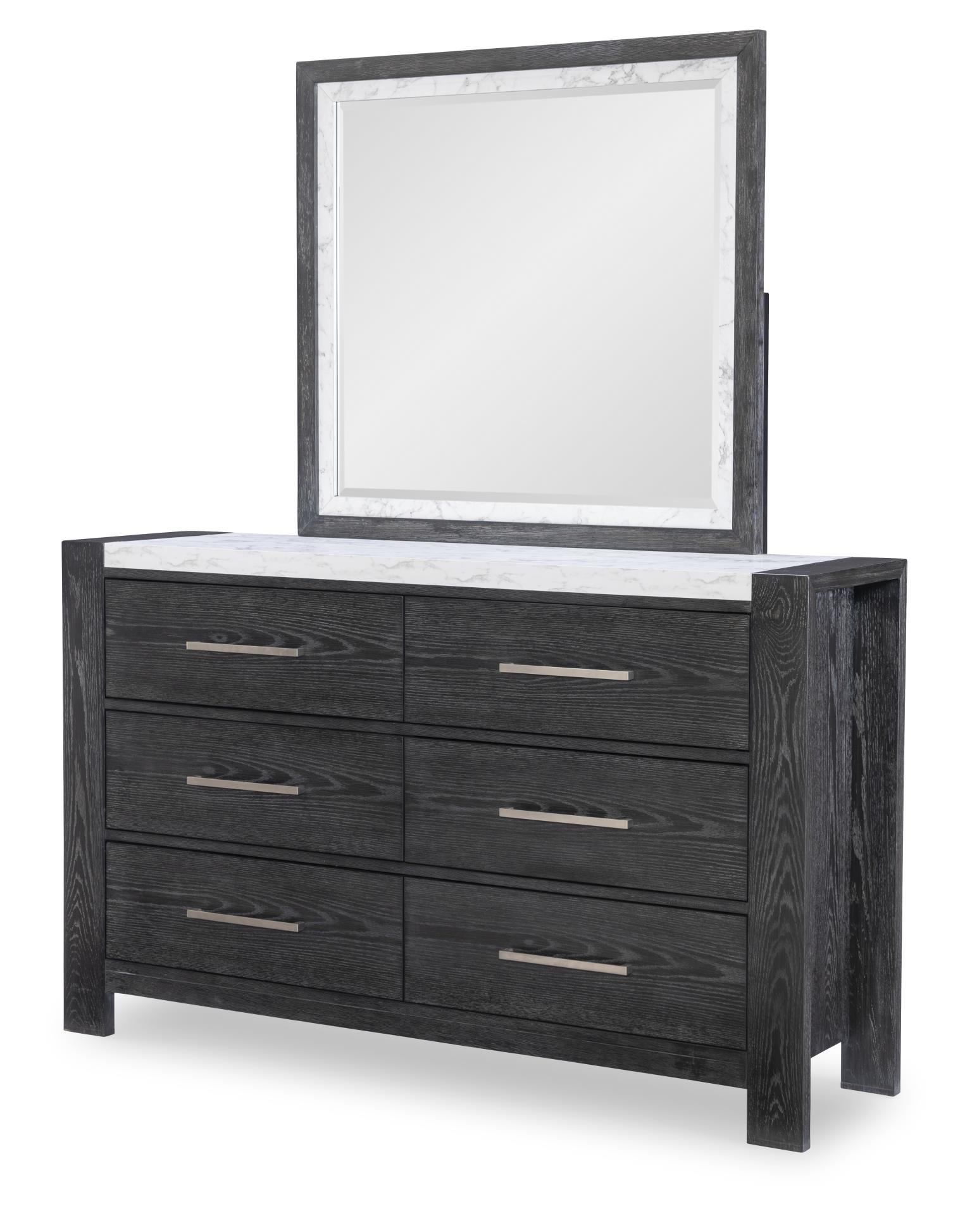 Casual elegance meets refined detail with the 5031 Horizons bedroom. The rich Espresso finish highlights the transitional appeal of oak veneer and select hardwood solids,, while modern design elements lend a fresh,, elevated touch to the bedroom. Marble laminate tops on the cases provide a cool contrast to the deep wood tones. Brushed nickel hardware pops against the dark finish. The panel headboard and dresser mirror feature marble laminate accents,, adding visual interest and tying into the case design. Designed with thoughtful craftsmanship,, drawers are built with French dovetail construction and ball bearing metal side glides,, offering smooth,, quiet function and quality. The bed is offered in twin,, full,, queen and king sizes.
