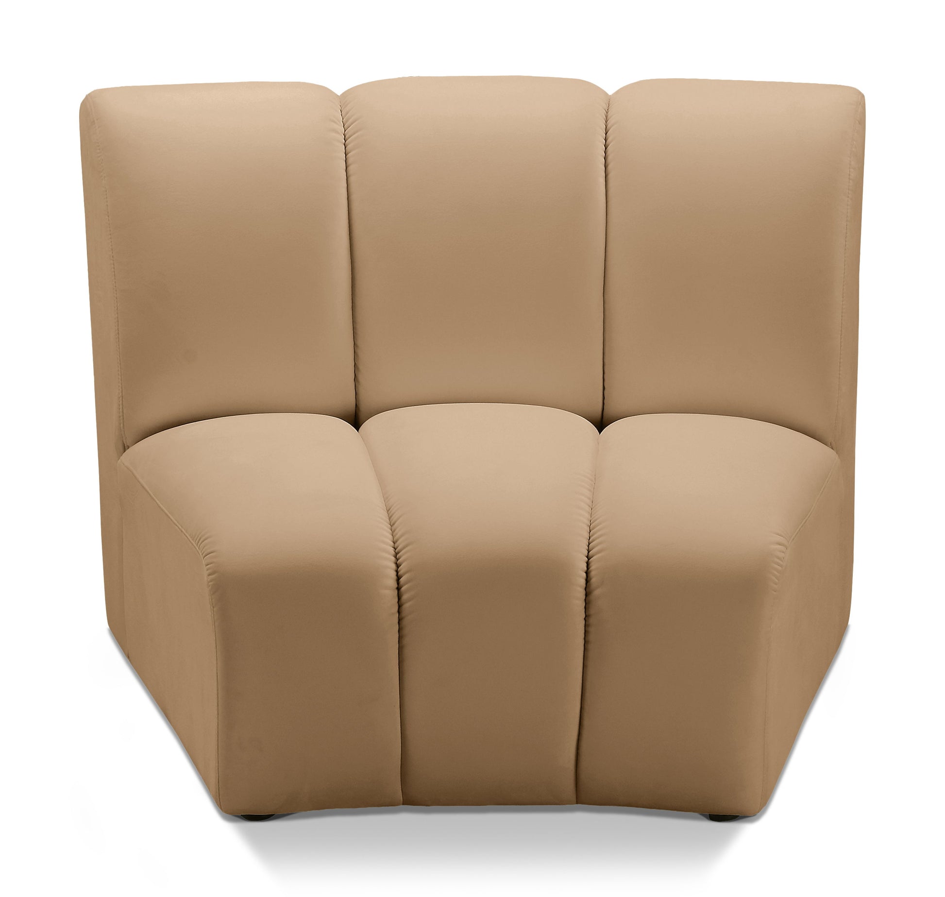 Create a seating group that works for every possible situation with this Infinity modular chair and other pieces in the Infinity collection. Upholstered in soft Camel velvet material that feels great against the skin and offers long-wearing beauty, this piece fits with other Infinity items for an infinite number of combinations that get your seating requirements just right but that look just as nice when used on their own.