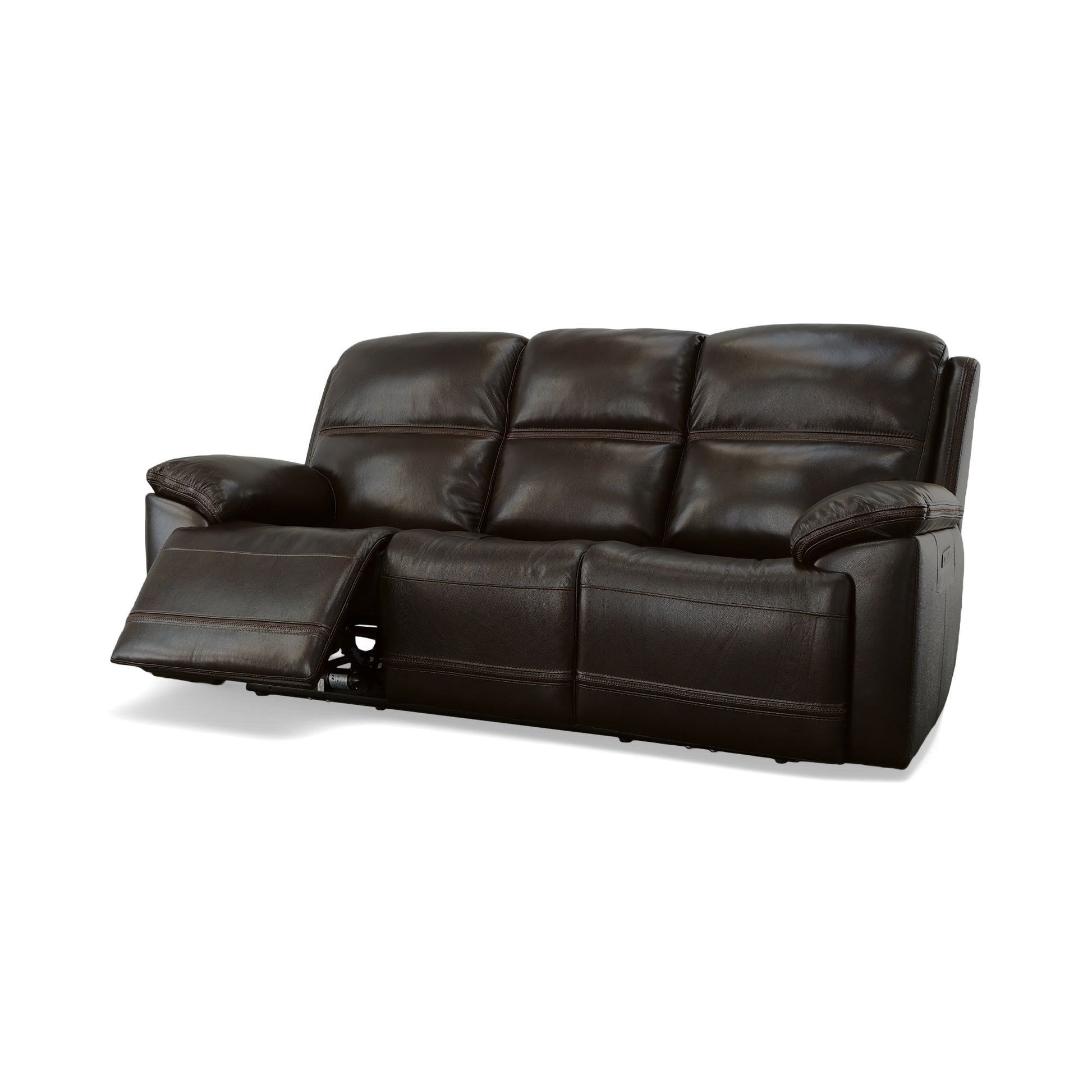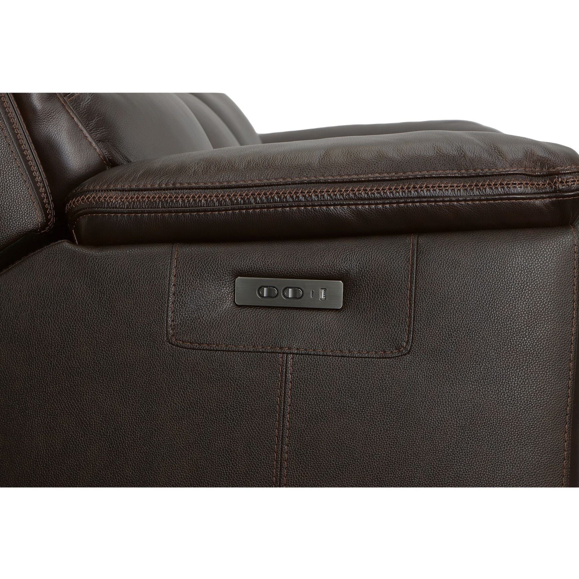 Inviting comfort and long-lasting support will make you want to stay nestled all day and night in the Jackson leather power reclining sofa. This sofa offers fine-tunable relaxation on the two outside seats with a dual power recline mechanism, adjustable headrests and Zero Gravity technology that reduces tension and pressure on the body. An attractive cross-stitch pattern on the back, armrest edges and footrests add distinctive style, while the waterfall chaise footrests and pillowy arms provide comfortable support. Built-in USB ports keep mobile devices conveniently charged and ready for streaming. With Flexsteel's patented Blue Steel Spring™ at the heart of each seat, and high-quality, dark brown leather, the Jackson power reclining sofa brings durability and a touch of rugged style to your home.