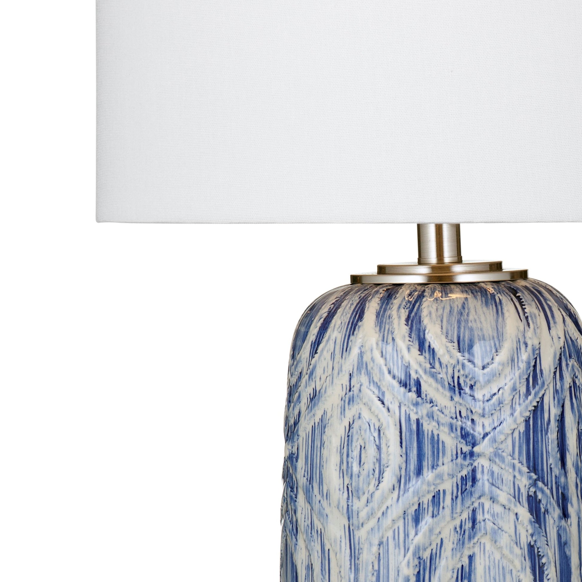 The Jeers Table Lamp is crafted of ceramic with a white drum shade. The lamp body is finished in white and blue.