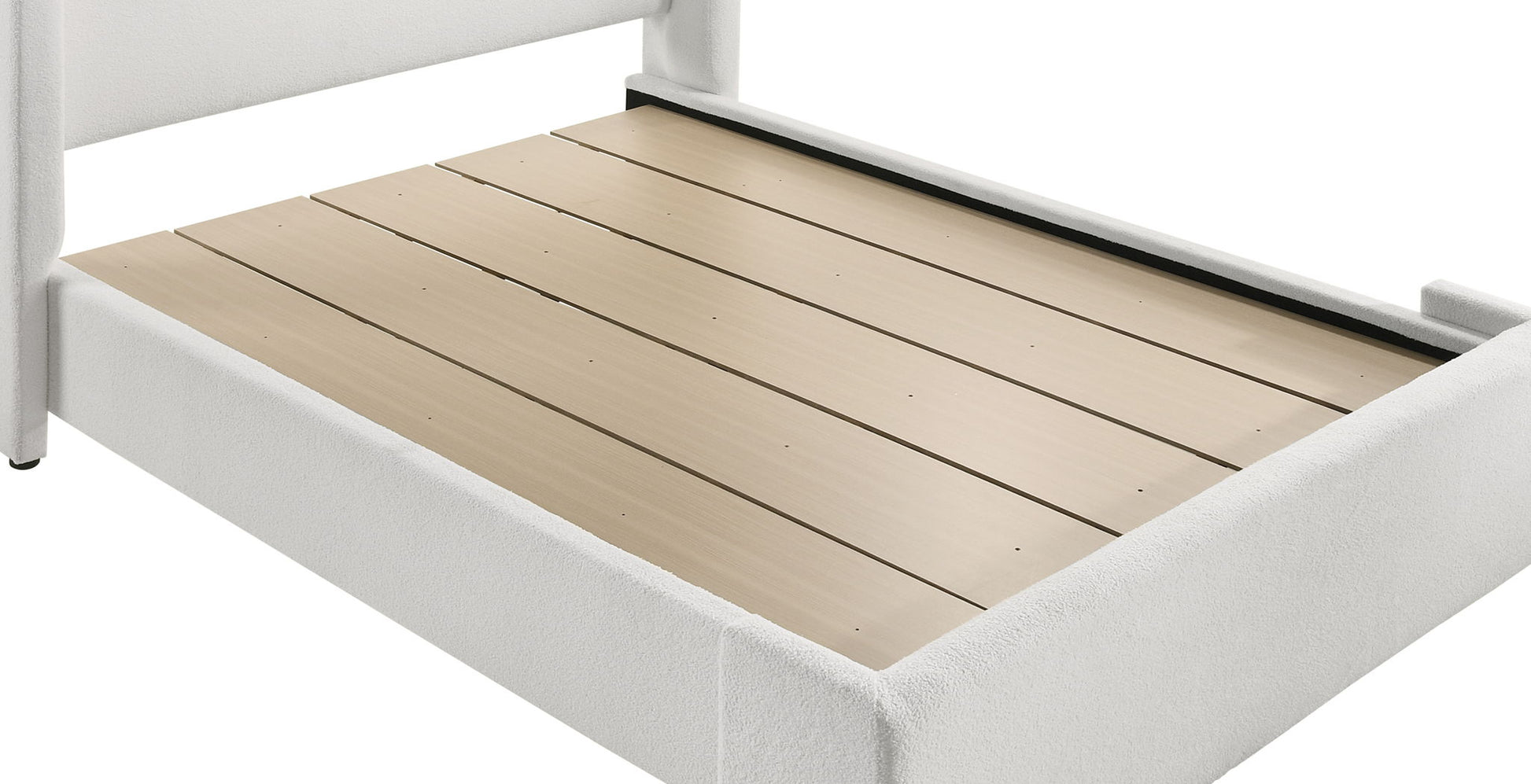 This lush contemporary bed frame is the perfect place to end your day. On trend boucle upholstery is stylish and timeless. Optional decking boards let you decide whether or not to use a box spring.